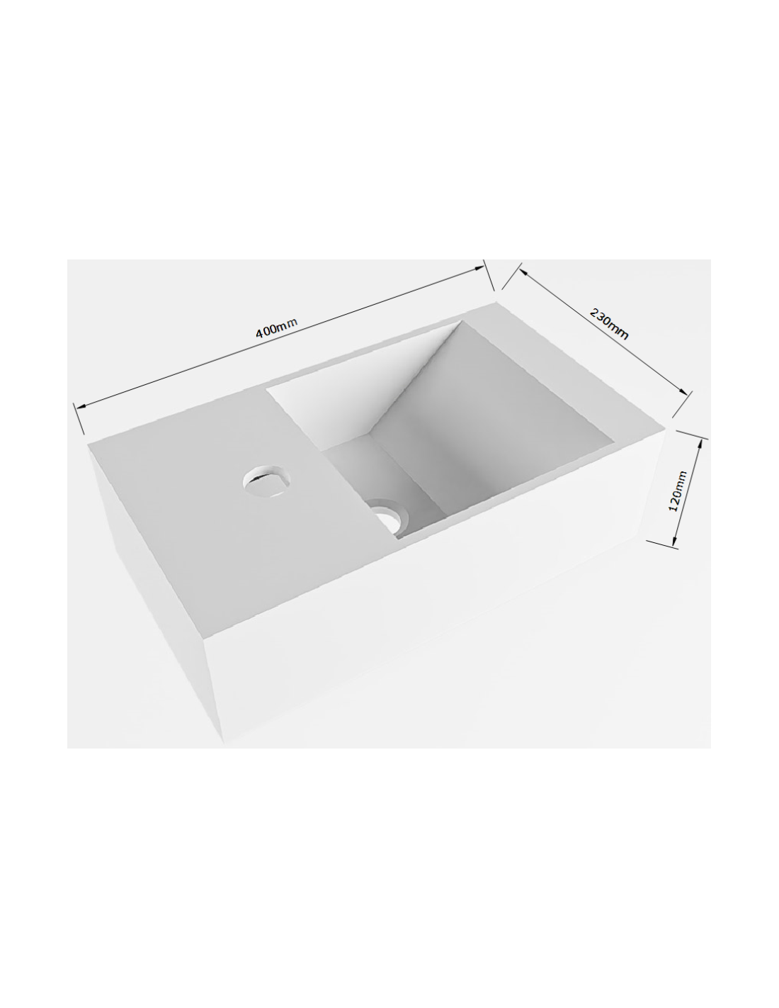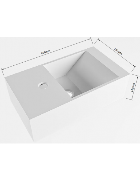 TYNE højrevendt håndvask udført i et moderne og stilrent design i det solide materiale "Solid Surface", der ikke alene giver badeværelset et stilrent design, men samtidig er lækkert at røre ved. Håndvasken måler 12 cm i højden og 40 x 23 cm i bredde og dybde (ydermål). Håndvasken leveres uden pop-up bundventil (almindelige standard bundventiler kan anvendes).