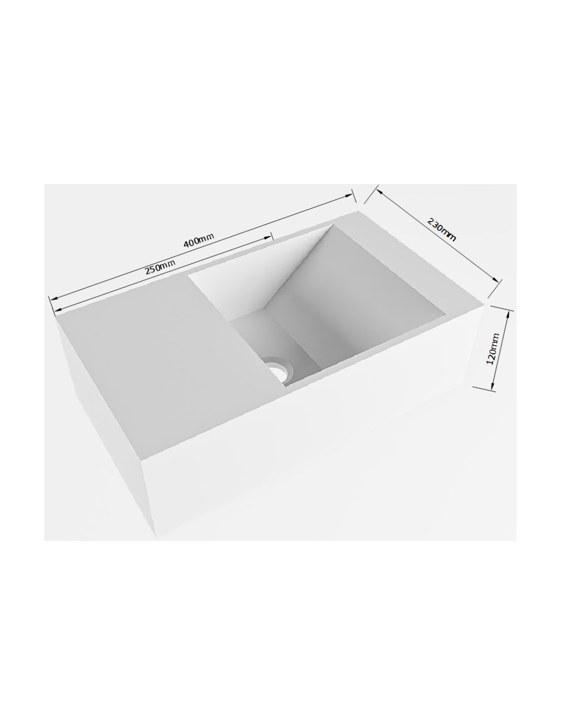 TYNE højrevendt håndvask udført i et moderne og stilrent design i det solide materiale "Solid Surface", der ikke alene giver badeværelset et stilrent design, men samtidig er lækkert at røre ved. Håndvasken måler 12 cm i højden og 40 x 23 cm i bredde og dybde (ydermål). Håndvasken leveres uden pop-up bundventil (almindelige standard bundventiler kan anvendes).