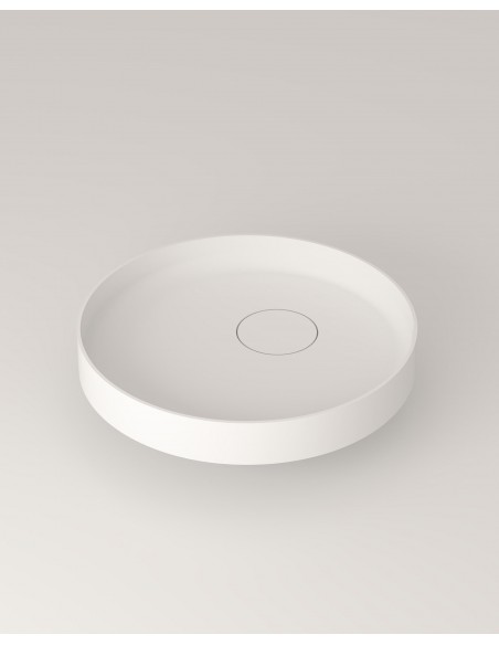 Bordmonteret håndvask fra Spanske ICÓNICO, udført i et design fremstillet i det solide materiale "Solid Surface", der ikke alene giver badeværelset et stilrent design, men samtidig er lækkert at røre ved. Håndvasken måler 14 cm i højden og 50 cm i diameter (ydermål). Leveres med bundventil. Vasken kan grundet dens ydre form, også nedsænkes i bordplade indtil bunden af den store del.