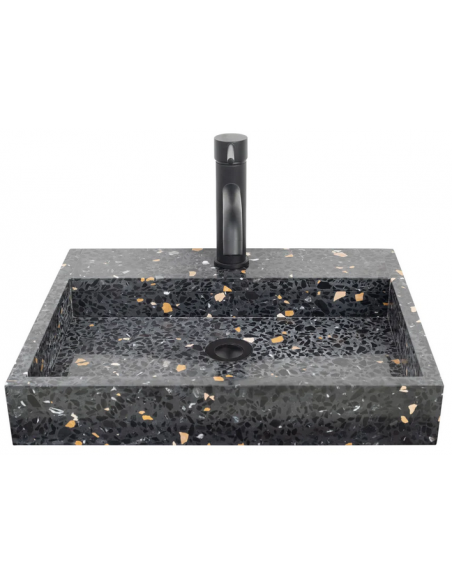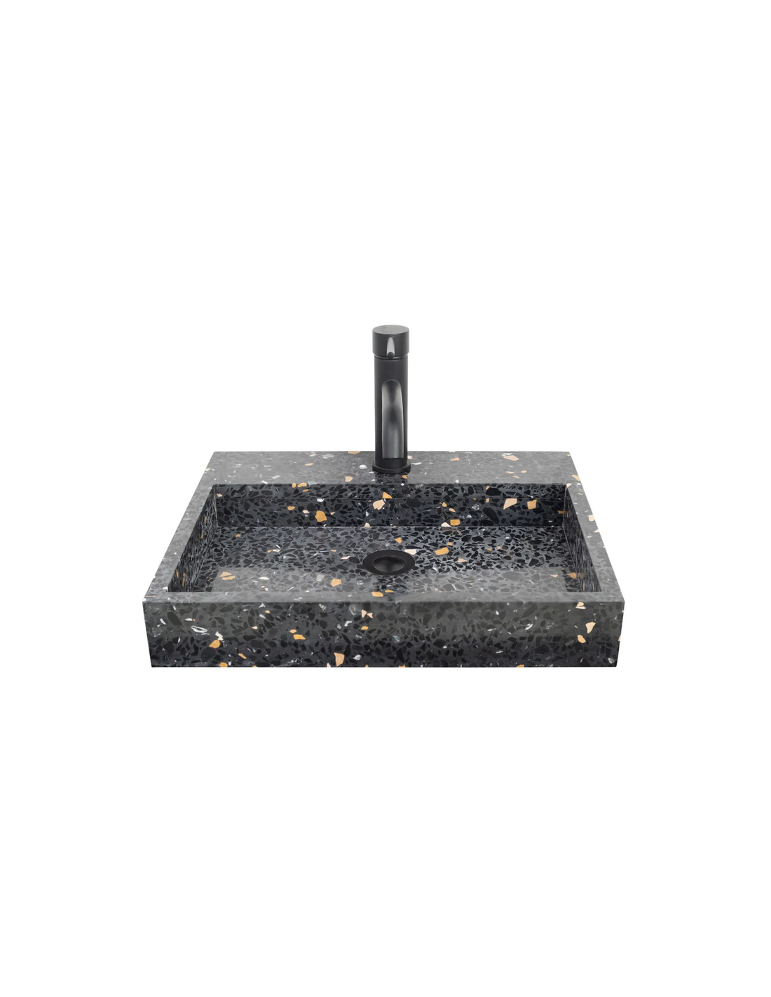 Bordmonteret håndvask udført i et design af sort terrazzo. Håndvasken måler 8 cm i højden og 48 x 38 cm i bredde og dybde (ydermål). Vasken leveres uden bundventil (standard mål).