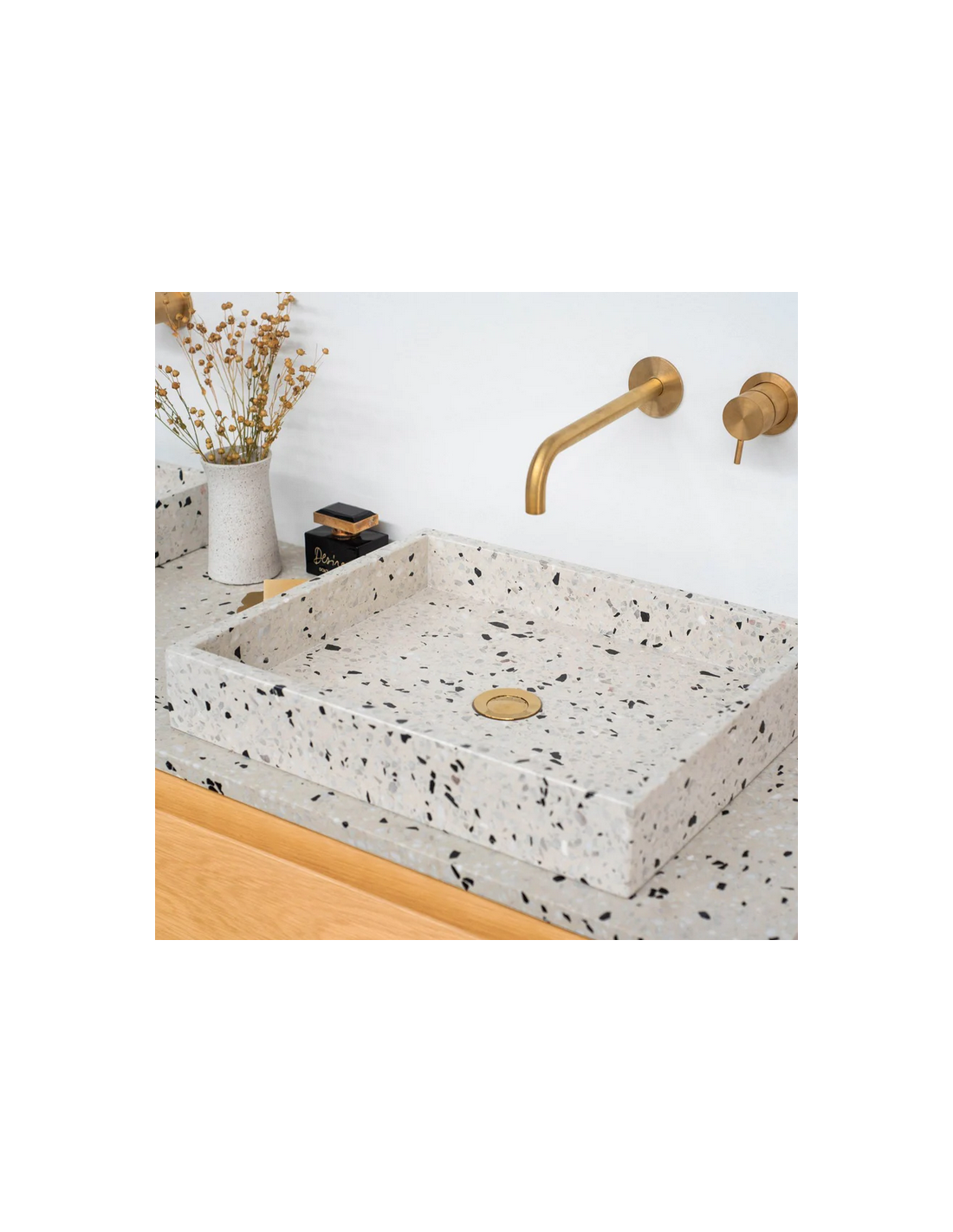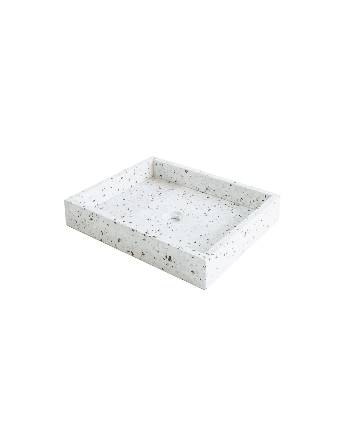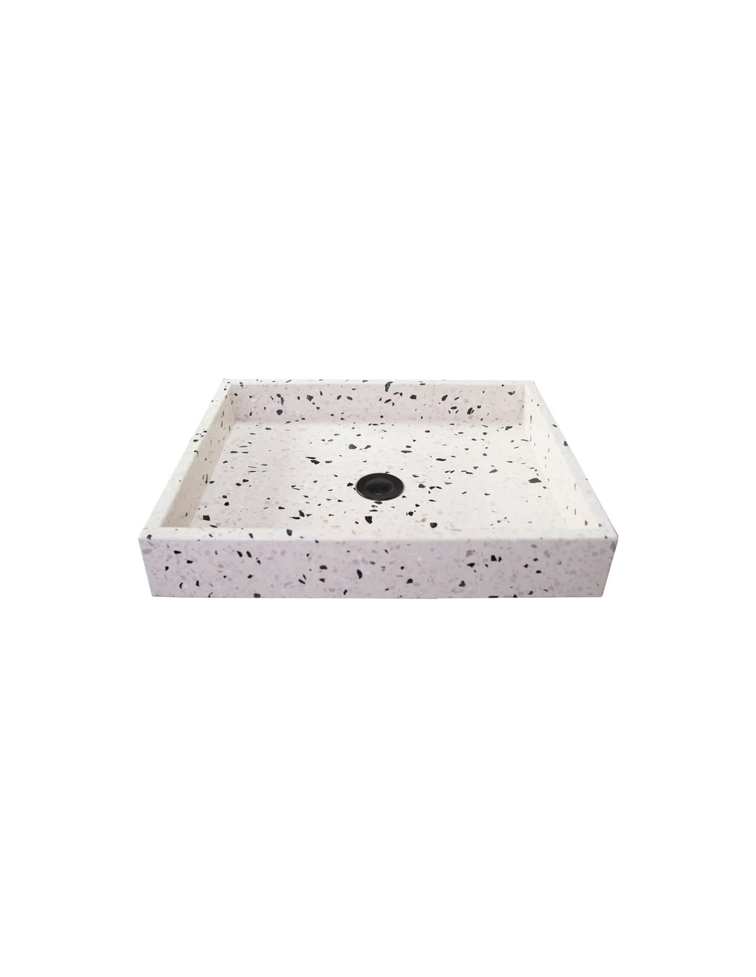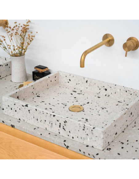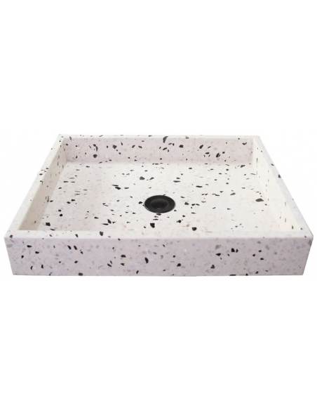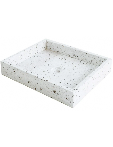 Bordmonteret håndvask udført i et design af gråhvid terrazzo. Håndvasken måler 8 cm i højden og 48 x 38 cm i bredde og dybde (ydermål). Vasken leveres uden bundventil (standard mål).