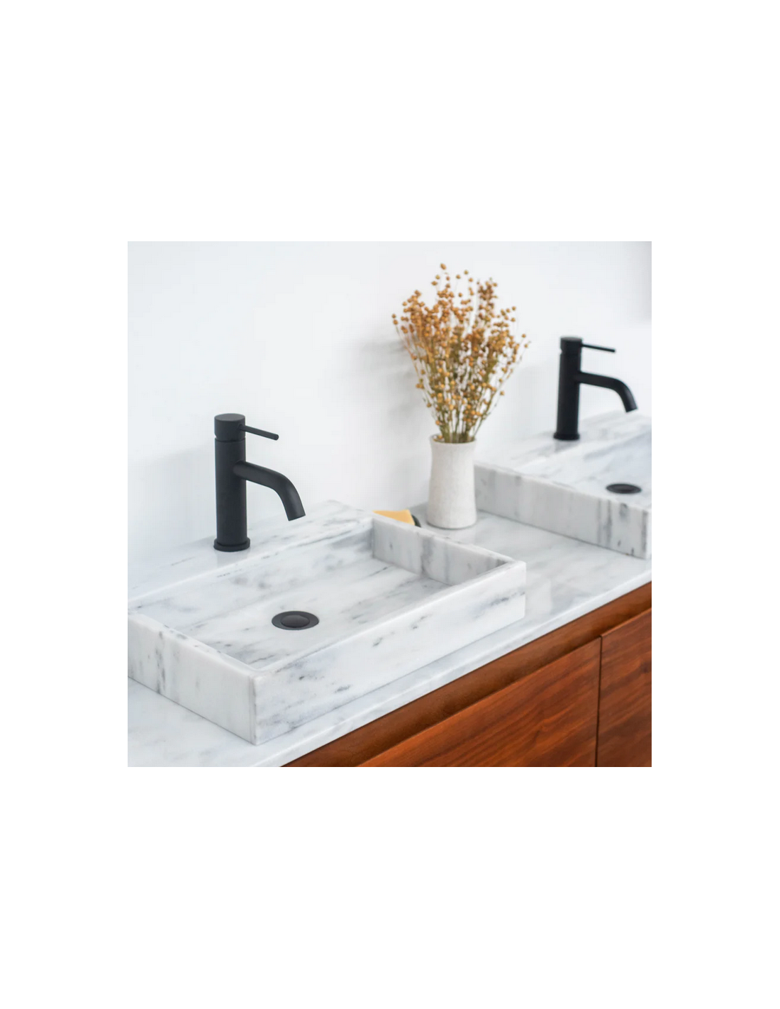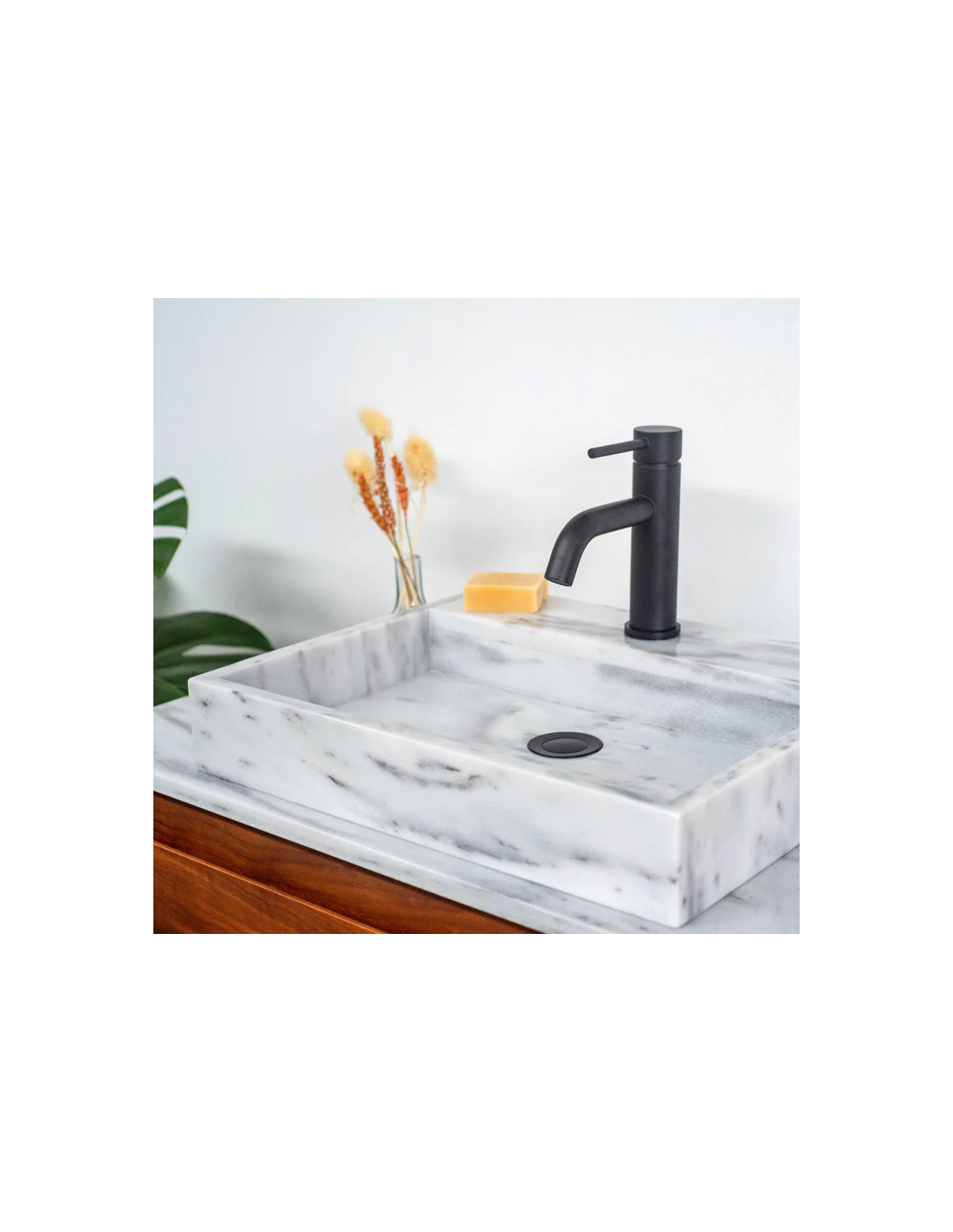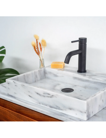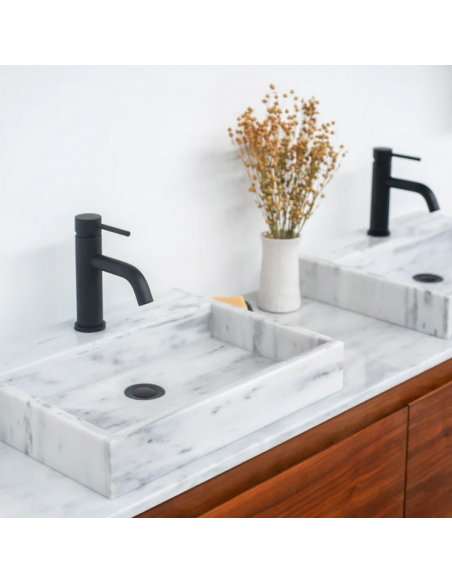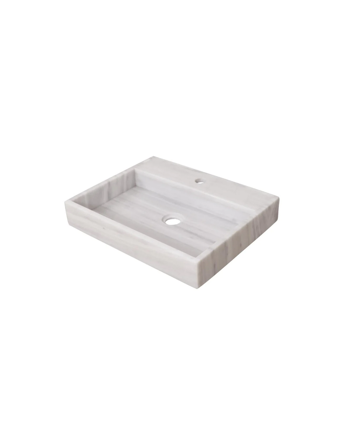 Bordmonteret håndvask udført i et design af hvid marmor. Håndvasken måler 8 cm i højden og 48 x 38 cm i bredde og dybde (ydermål). Vasken leveres uden bundventil (standard mål). Bemærk venligst, at da der er tale om et naturmateriale, så vil 2 håndvaske ikke være helt ens i strukturen. Hertil kán der være en mindre variation i nuancen i forhold til de viste produktbilleder.