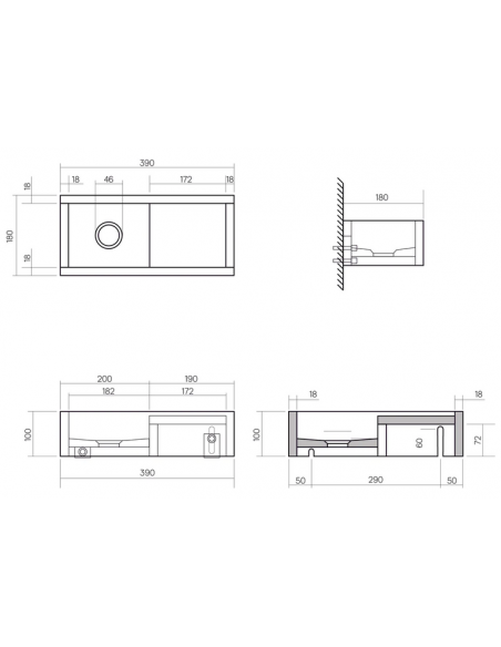 Håndvasken kan kun monteres i den viste opsætning med armaturhul mod højre.