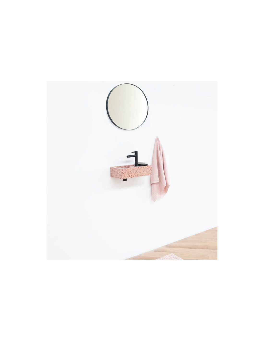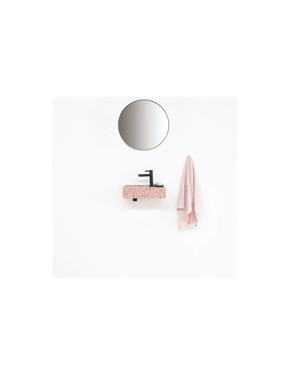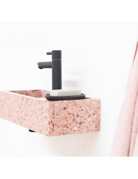 Vægmonteret håndvask udført i et design af rosa terrazzo. Håndvasken måler 10 cm i højden og 39 x 18 cm i bredde og dybde (ydermål). Vasken leveres uden bundventil (standard mål).