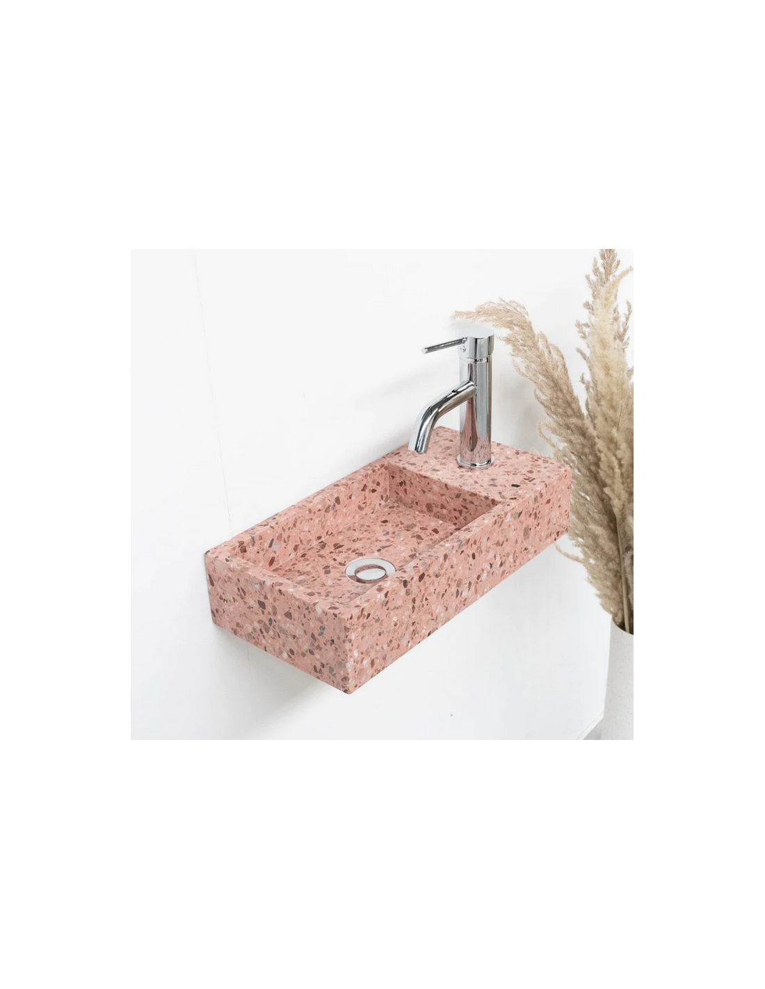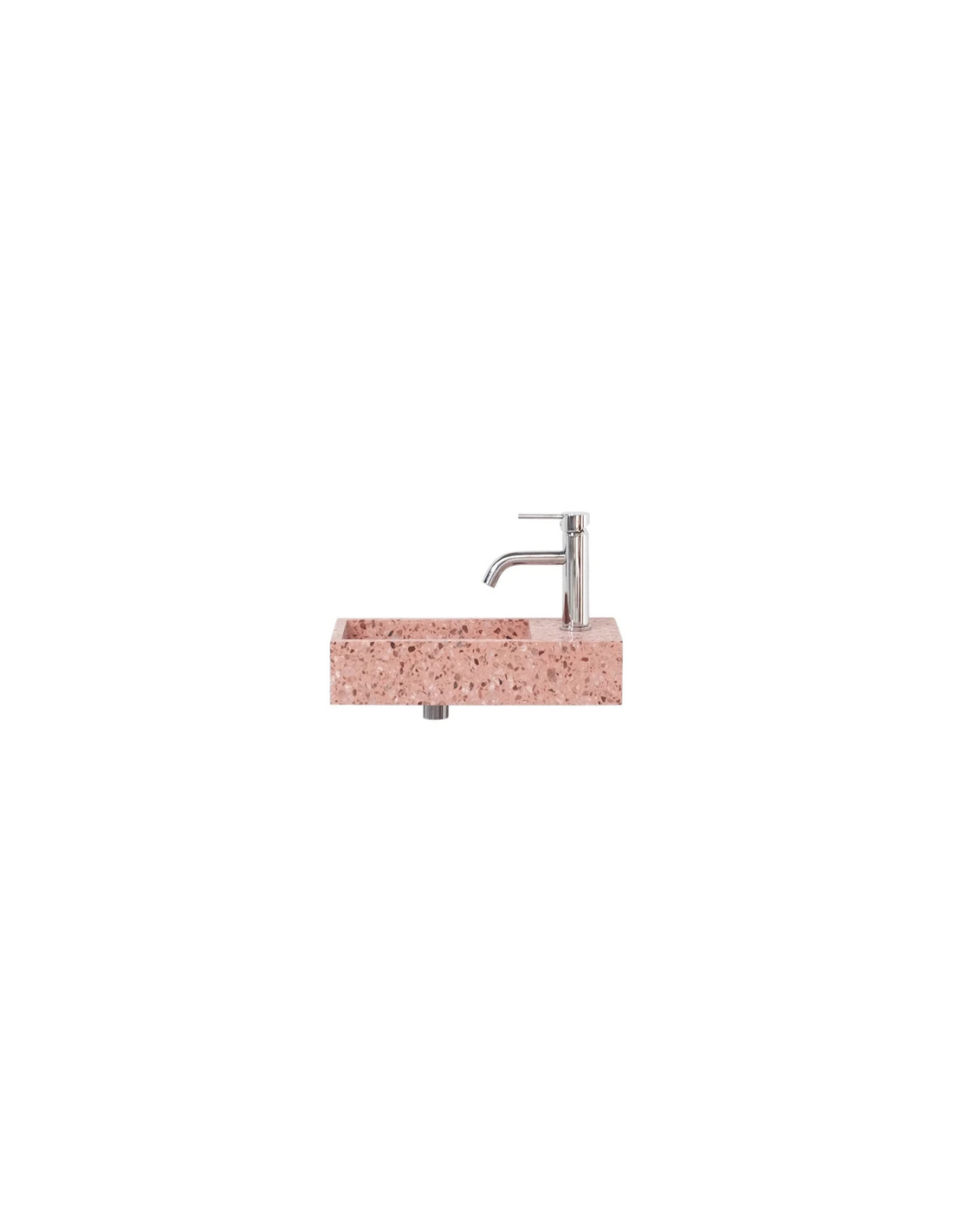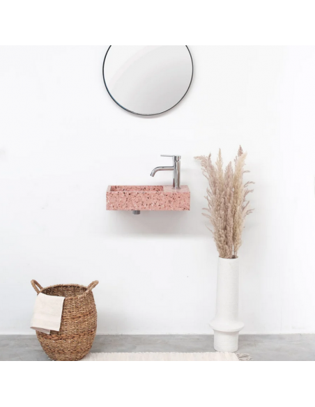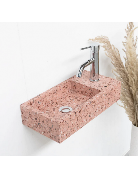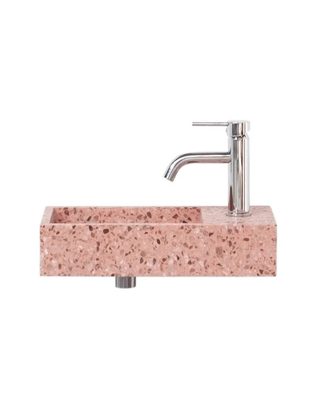 Vægmonteret håndvask udført i et design af rosa terrazzo. Håndvasken måler 10 cm i højden og 45 x 22 cm i bredde og dybde (ydermål). Vasken leveres uden bundventil (standard mål).