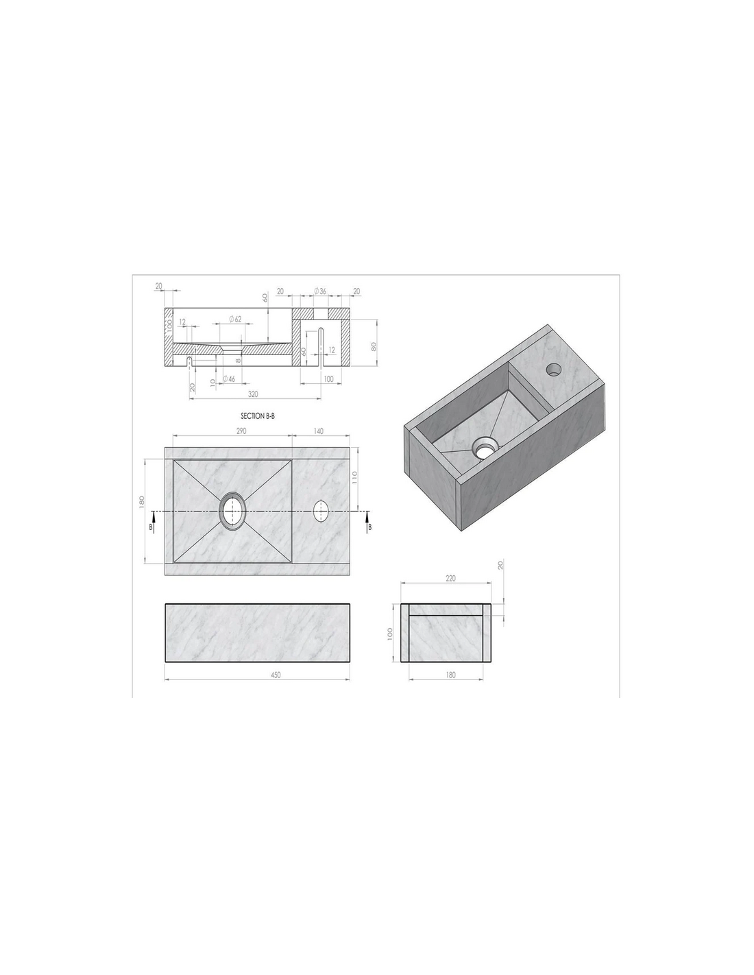 • Kan kun monteres i den viste opsætning med armaturhul mod højre