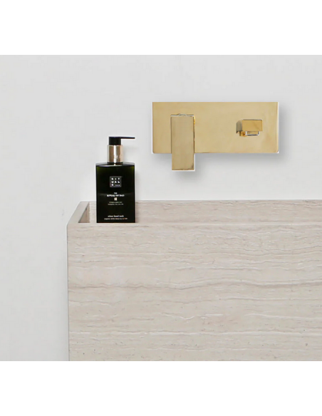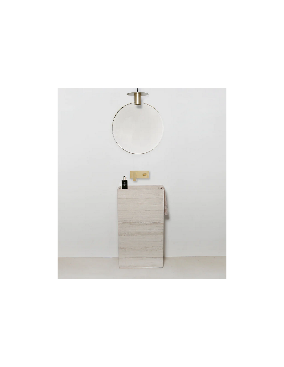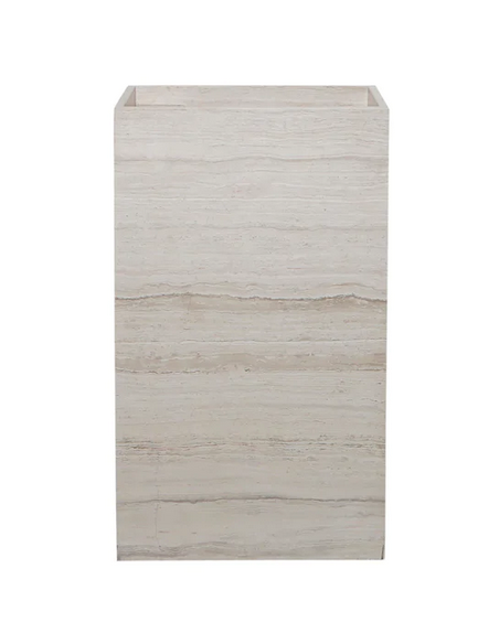 Gulvmonteret håndvask udført i et design af beige marmor. Håndvasken måler 90 cm i højden og 60 x 30 cm i bredde og dybde (ydermål). Vasken leveres uden bundventil (standard mål). Bemærk venligst, at da der er tale om et naturmateriale, så vil 2 håndvaske ikke være helt ens i strukturen. Hertil kán der være en mindre variation i nuancen i forhold til de viste produktbilleder.