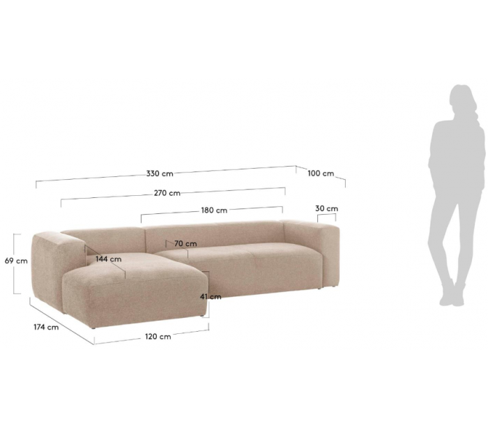Chaiselong sofa udført i et moderne skandinavisk design fra LaForma. Sofaen er fremstillet i beige polyester og akrylfibre og måler 330 x 174 cm i bredde og dybde - denne model er venstrevendt. Modulerne forbindes til hinanden via klammer.
