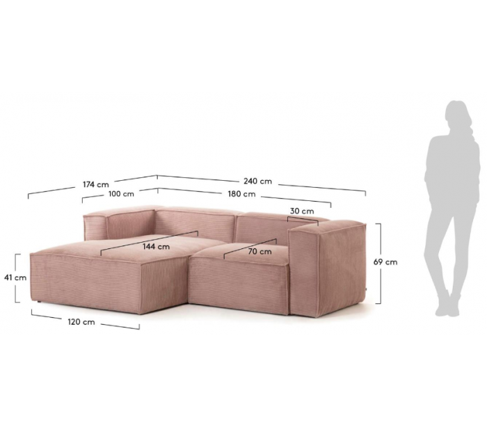 Chaiselong sofa udført i et moderne skandinavisk design fra LaForma. Sofaen er fremstillet i pink ripcurl velour og måler 240 x 174 cm i bredde og dybde - denne model er venstrevendt. Modulerne forbindes til hinanden via klammer.