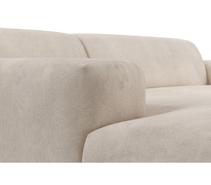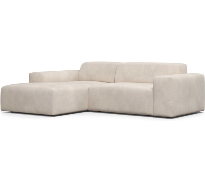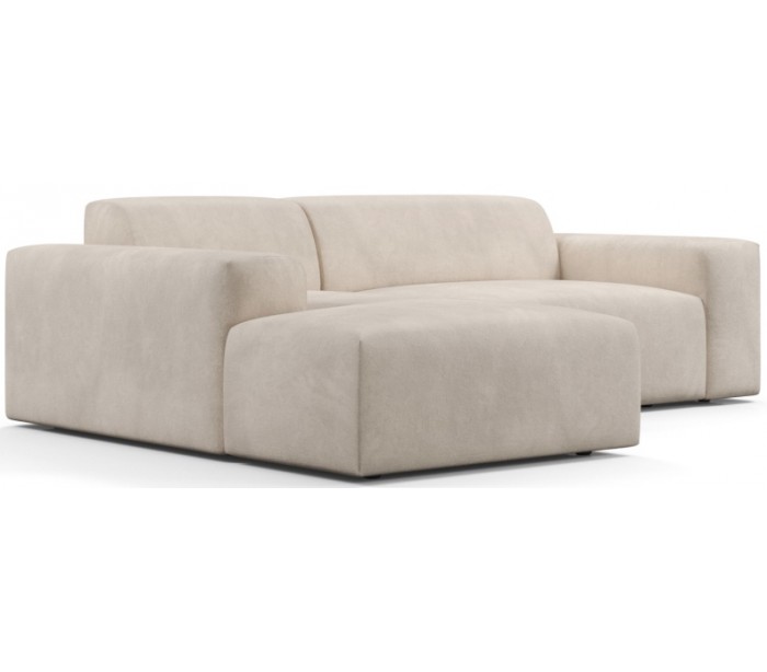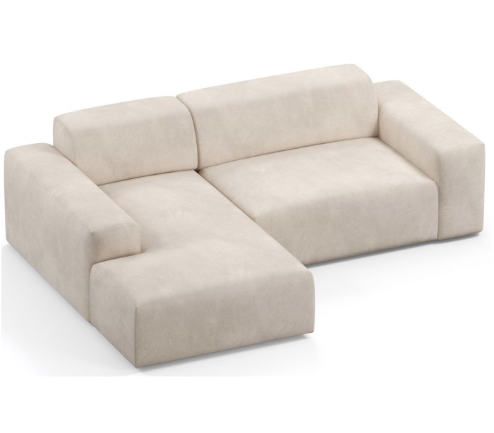 Moderne venstrevendt chaiselong sofa i et design fremstillet i beige velour. Sofaen måler 250 x 185 cm i bredde og dybde og 71 cm i højden over ryggen. Sofaen er polstret med højkvalitets skum. En lækker slængesofa med dyb siddestilling.
