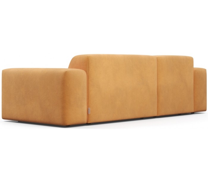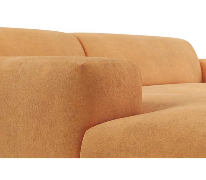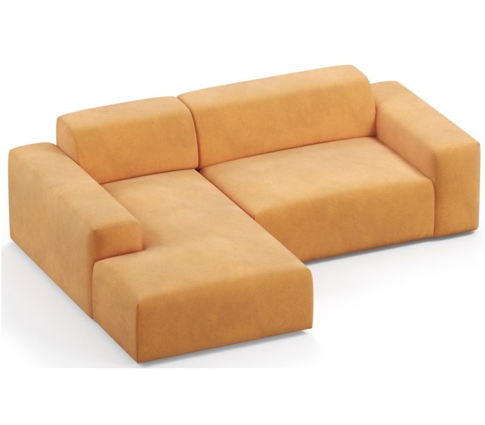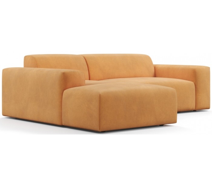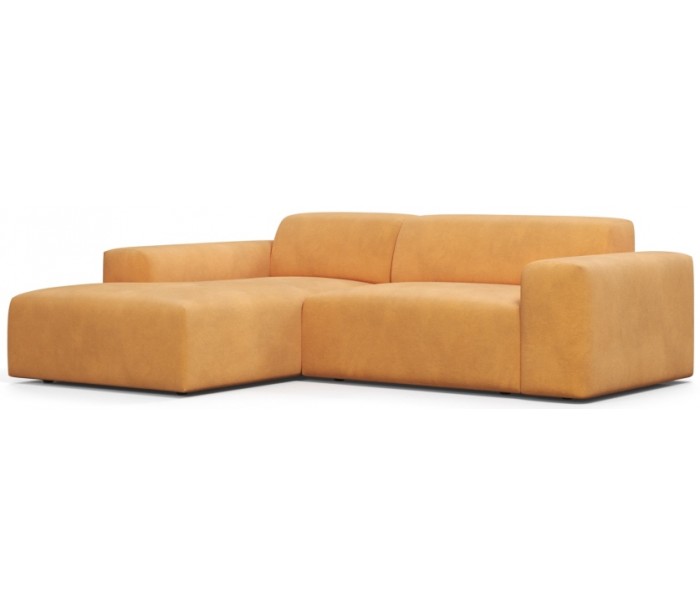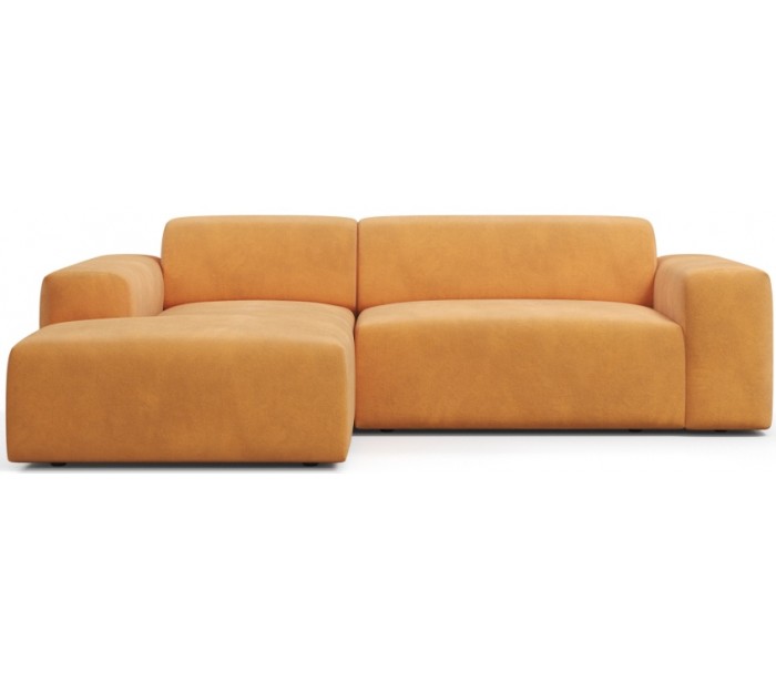 Moderne venstrevendt chaiselong sofa i et design fremstillet i sennepsfarvet velour. Sofaen måler 250 x 185 cm i bredde og dybde og 71 cm i højden over ryggen. Sofaen er polstret med højkvalitets skum. En lækker slængesofa med dyb siddestilling.