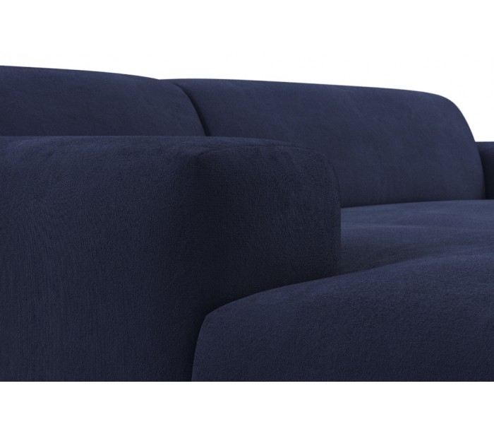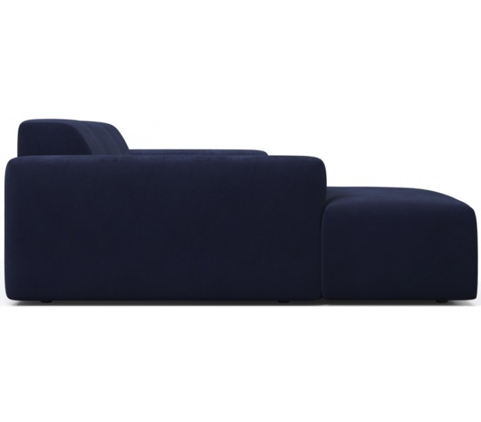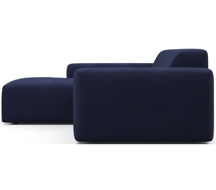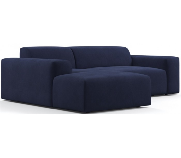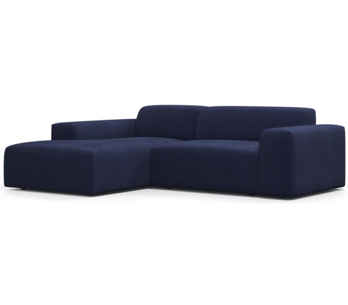 Moderne venstrevendt chaiselong sofa i et design fremstillet i blå velour. Sofaen måler 250 x 185 cm i bredde og dybde og 71 cm i højden over ryggen. Sofaen er polstret med højkvalitets skum. En lækker slængesofa med dyb siddestilling.