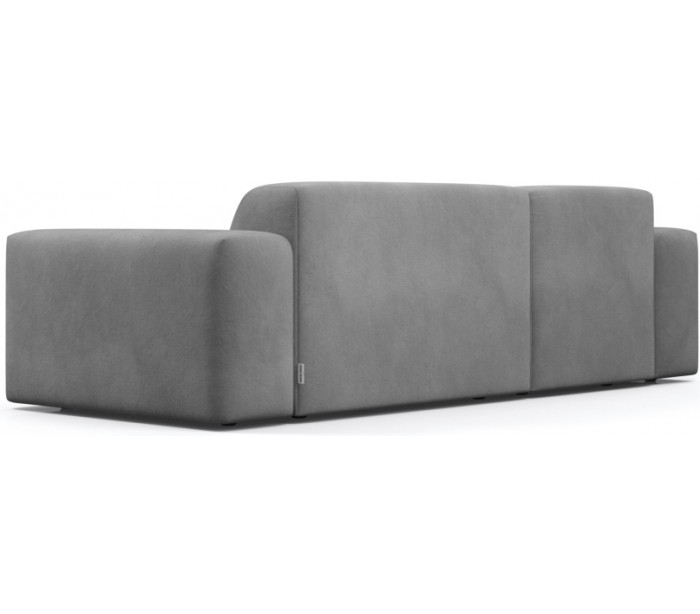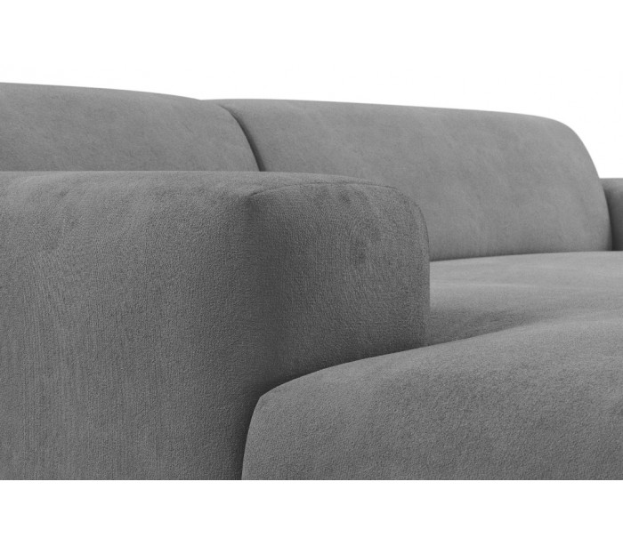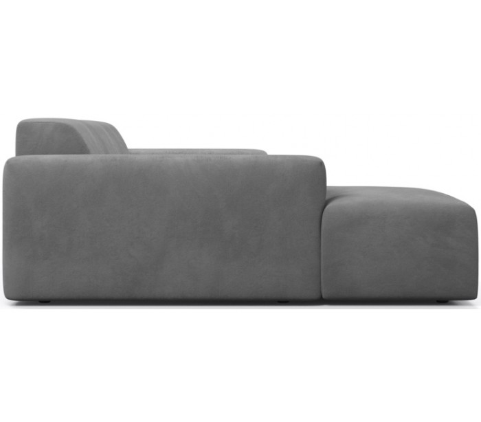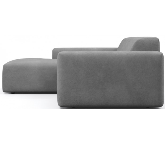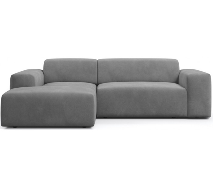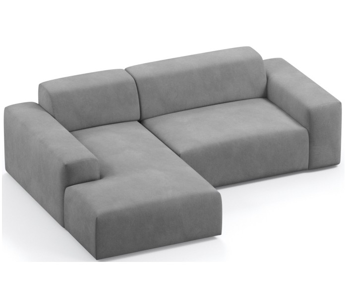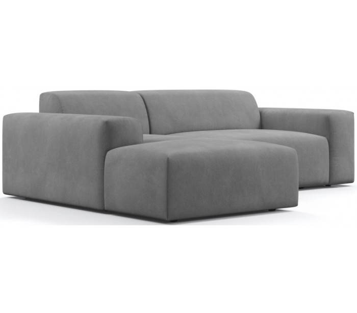 Moderne venstrevendt chaiselong sofa i et design fremstillet i lysegrå velour. Sofaen måler 250 x 185 cm i bredde og dybde og 71 cm i højden over ryggen. Sofaen er polstret med højkvalitets skum. En lækker slængesofa med dyb siddestilling.