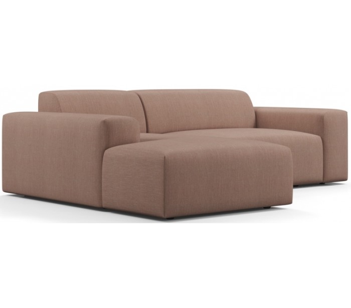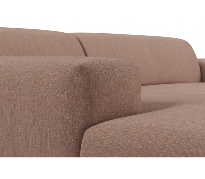Moderne venstrevendt chaiselong sofa i et design fremstillet i svag rosa polyester. Sofaen måler 250 x 185 cm i bredde og dybde og 71 cm i højden over ryggen. Sofaen er polstret med højkvalitets skum. En lækker slængesofa med dyb siddestilling.