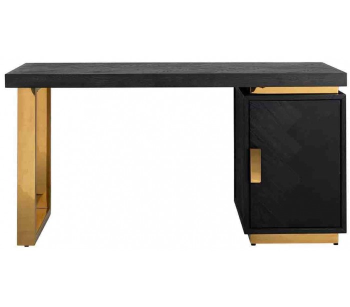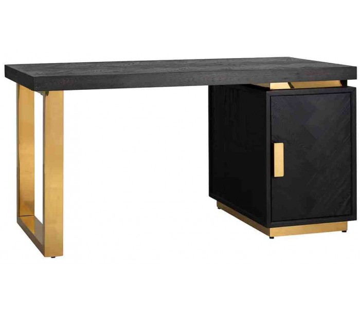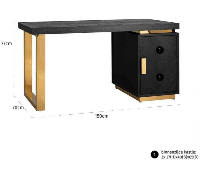 Skrivebord i et design fra hollandske Richmond Interiors. Skrivebordet er fremstillet i egetræ og stel i guldfarvet stål og måler 150 x 70 cm i bredde og dybde og 77 cm i højden.