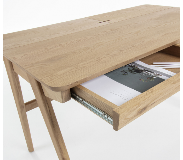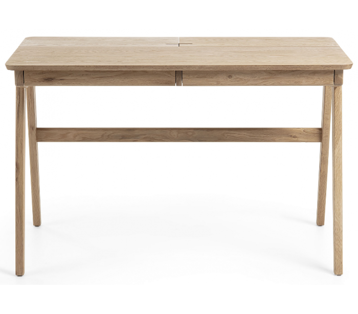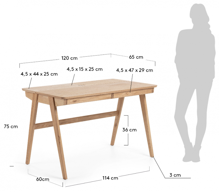 Skrivebord i et design fra LaForma. Bordet er fremstillet i naturfarvet ask finér. Bordet måler 75 cm i højden og 120 x 65 cm i bredde og dybde og kommer med 2 skuffer med indermålene 4,5 x 47 x 29 cm. Hertil 2 opbevaringsrum.