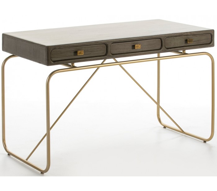 Skrivebord udført i et let moderne, men rustikt design i antik guldfarvet metal og grålakeret træ og med 3 skuffer. Skrivebordet måler 120 cm i bredden og 60 cm i dybden. Frihøjden under skrivebordet måler 61 cm.