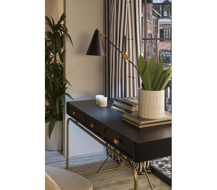 Skrivebord udført i et let moderne, men rustikt design i antik guldfarvet metal og sortbejset træ og med 3 skuffer. Skrivebordet måler 120 cm i bredden og 60 cm i dybden. Frihøjden under skrivebordet måler 61 cm.