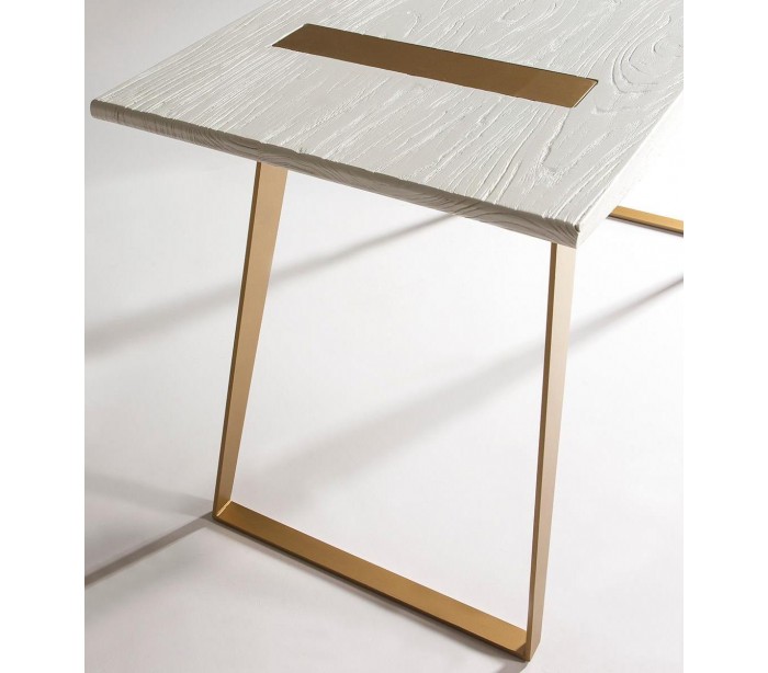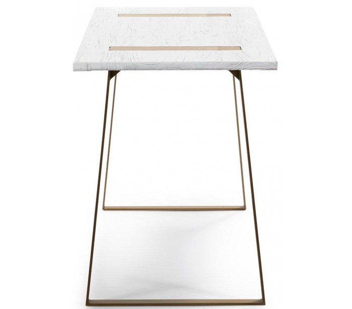 Skrivebord udført i et let moderne, men rustikt design i antik guldfarvet metal og antik hvidbejset træ. Skrivebordet måler 140 cm i bredden og 60 cm i dybden.