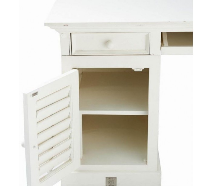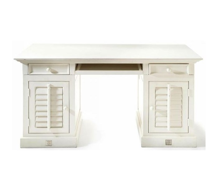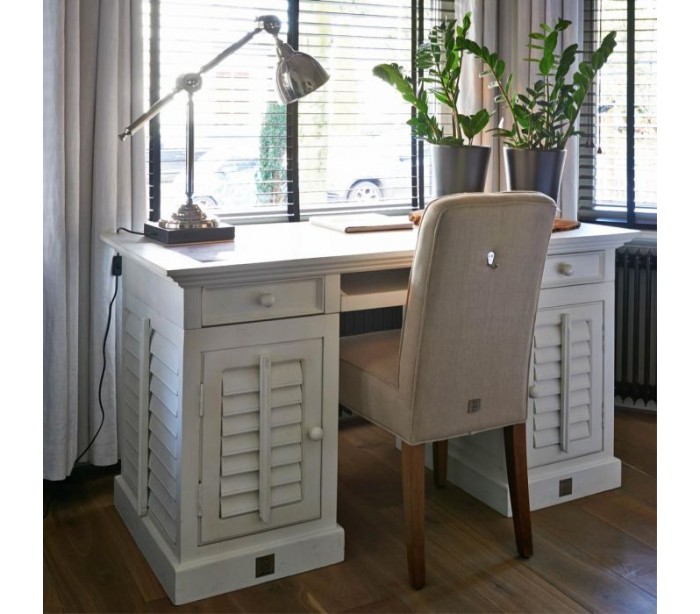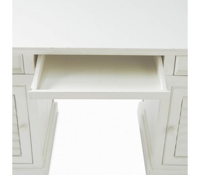 Skrivebord fra Riviera Maison, udført i et design af massiv antik hvidlakeret akacietræ. Skrivebordet kommer med 2 skuffer og 2 skabe og måler 80 cm i højden og 150 cm i bredde og 70 cm i dybde. Frihøjde under bordet er 65 cm.