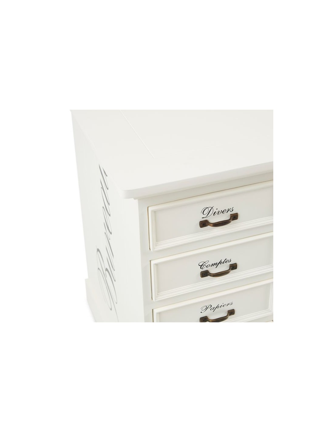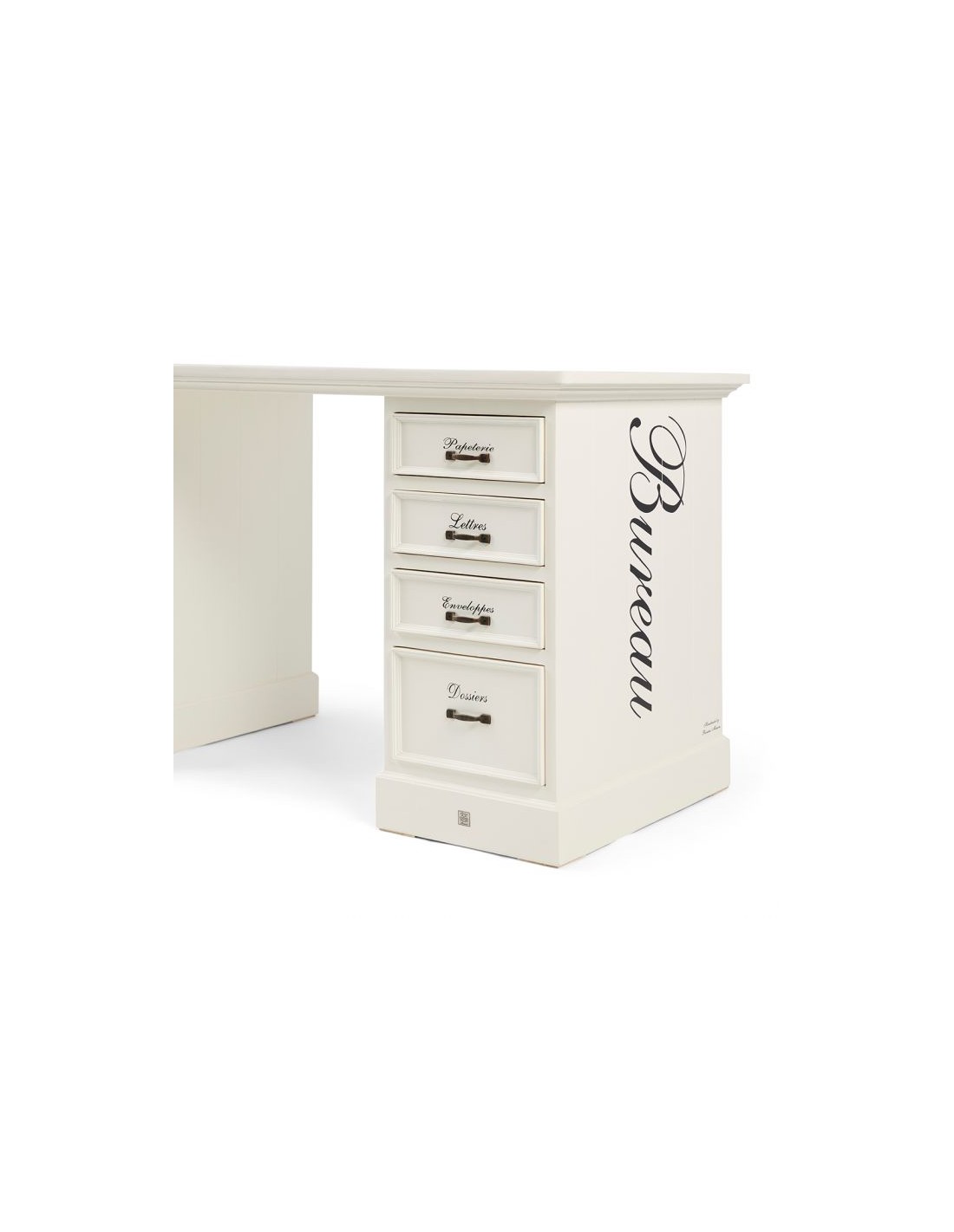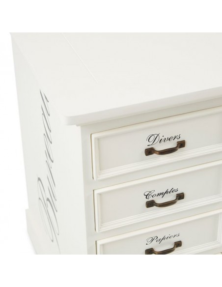 Skrivebord fra Riviera Maison, udført i et design af massiv antik hvidlakeret hårdtræ. Skrivebordet kommer med 8 skuffer og måler 80 cm i højden og 150 cm i bredde og 70 cm i dybde. Frihøjde under bordet er 75 cm.