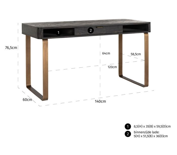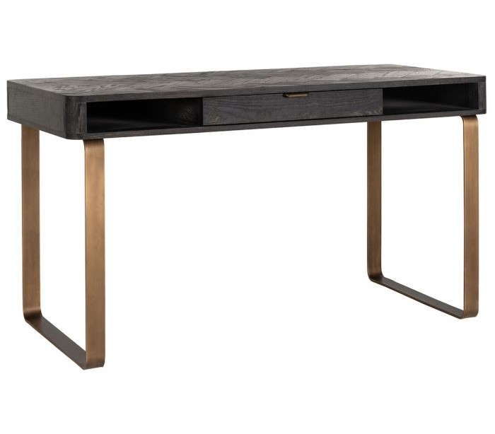 Skrivebord i et design fra hollandske Richmond Interiors. Skrivebordet er fremstillet i børstet sortlakeret egetræ og stel i antik messingfarvet stål og måler 140 x 60 cm i bredde og dybde og 76,5 cm i højden.