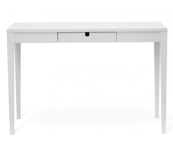 Skrivebord i et moderne design, fremstillet i hvidlakeret birketræ og mdf. Skrivebordet måler 110 x 45 cm i bredde og dybde og 75 cm i højden. I bordet findes 1 skuffe til opbevaring.