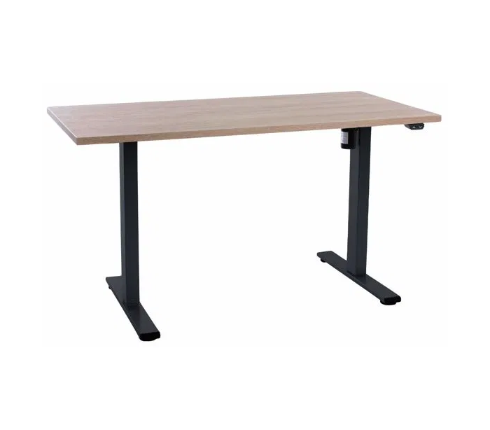 EP Home hæve sænke skrivebord, udført i et design med sortlakeret stel og bordplade i egetræsfarvet laminat. Skrivebordet måler 71 - 121 cm i højden og 140 x 70 cm i bredde og dybde. Bordet justeres via 2-knaps el-betjening.