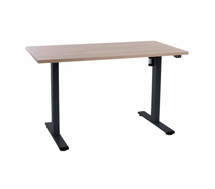 EP Home hæve sænke skrivebord, udført i et design med sortlakeret stel og bordplade i egetræsfarvet laminat. Skrivebordet måler 71 - 121 cm i højden og 120 x 60 cm i bredde og dybde. Bordet justeres via 2-knaps el-betjening.