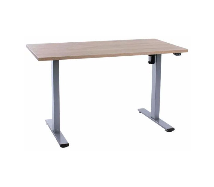 EP Home hæve sænke skrivebord, udført i et design med grålakeret stel og bordplade i egetræsfarvet laminat. Skrivebordet måler 71 - 121 cm i højden og 120 x 60 cm i bredde og dybde. Bordet justeres via 2-knaps el-betjening.