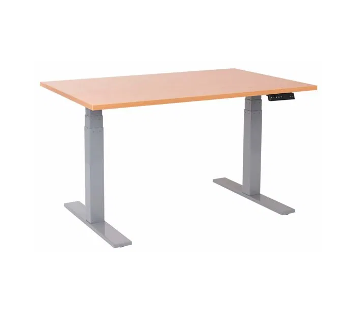 EP 6000 Hæve sænke skrivebord, udført i et design med alulakeret stel og bordplade i bøgetræsfarvet laminat. Skrivebordet måler 65 - 130 cm i højden og 140 x 80 cm i bredde og dybde. Bordet justeres via 2-knaps el-betjening med memory funktion.