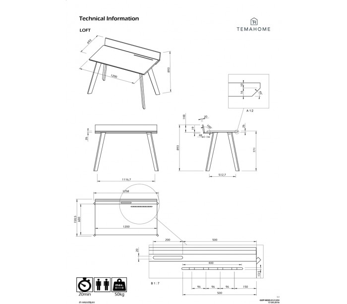 TemaHome Loft skrivebord udført i et design af egetræsfarvet MDF. Skrivebordet måler 77 - 89 cm i højden og 120 x 70 cm i bredde og dybde. Højde fra gulv til skrivebordspladen er 75 cm.