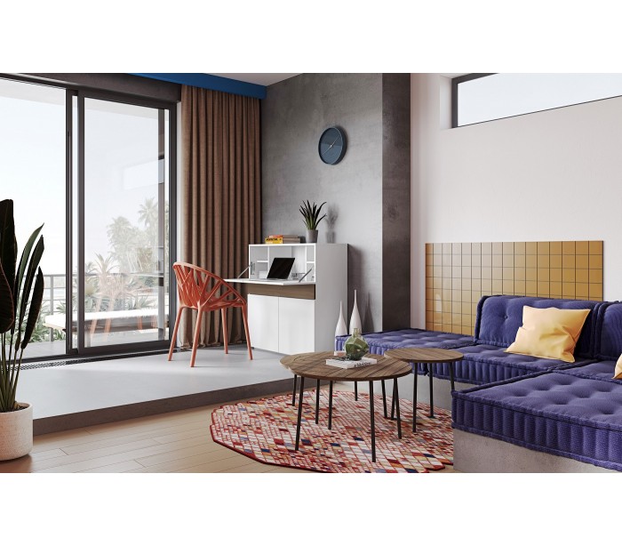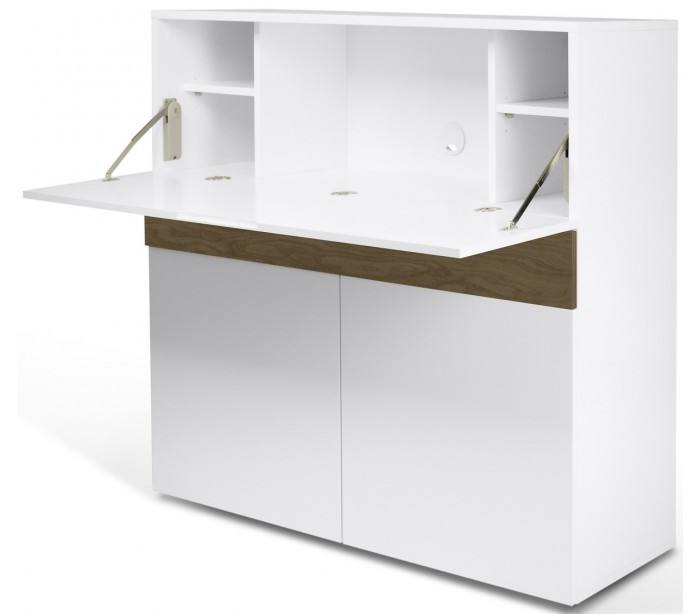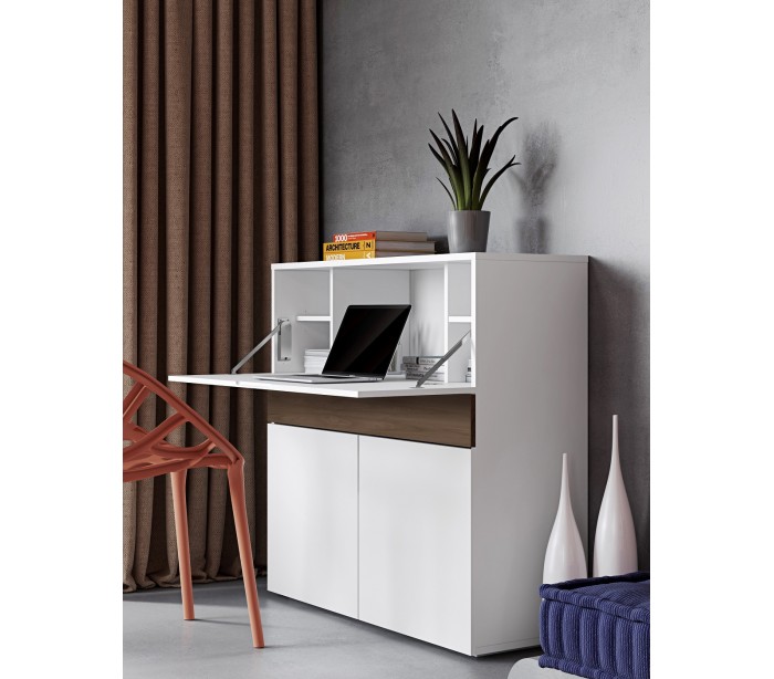 TemaHome Focus arbejdsstation/skrivebord udført i et design af valnødde- og mat hvidfolieret finér. Skrivebordet måler 103 cm i højden og 110 x 42 cm i bredde og dybde. Ved udslået skrivebordsplade, er højde fra gulv til skrivebordspladen 73 cm.