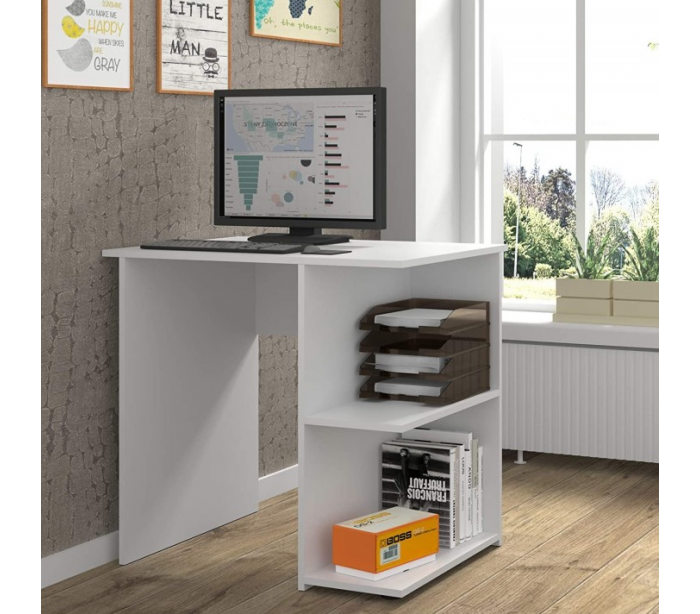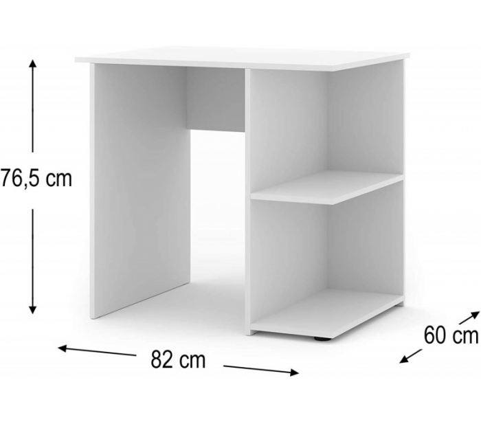 Poko skrivebord udført i et design af hvid møbelplade. Skrivebordet måler 76,5 cm i højden og 82 x 60 cm i bredde og dybde.