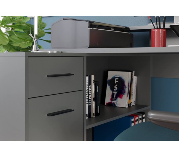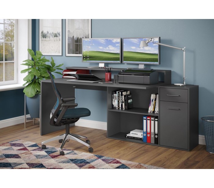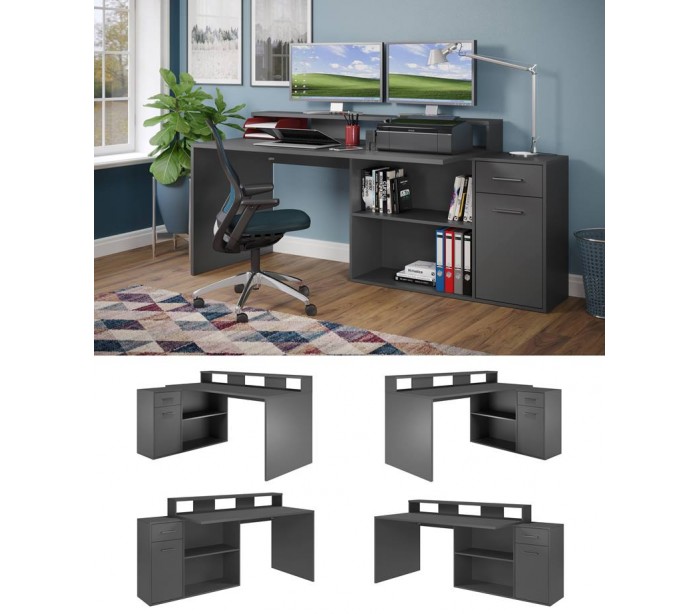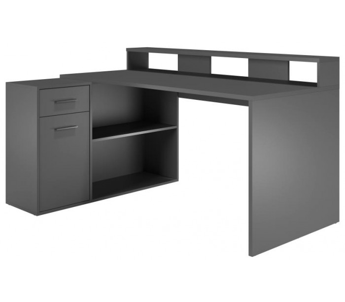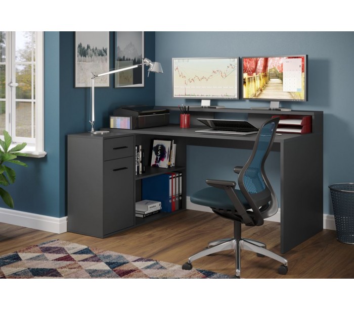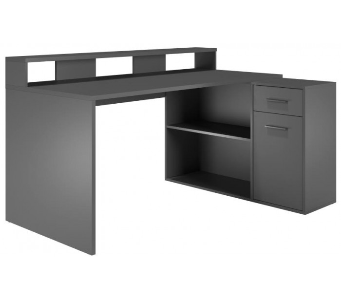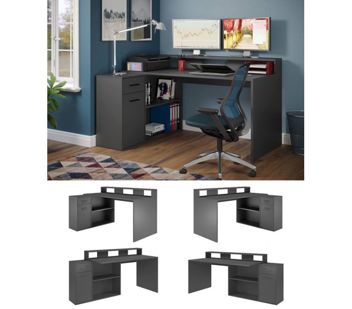Gamer skrivebord udført i et design af antracitfarvet møbelplade. Skrivebordet kan opsættes i valgfri opsætning og måler som vinkel 160 x 115 cm i bredde og dybde.