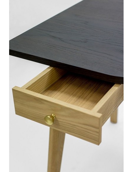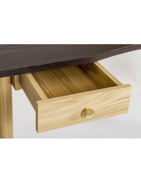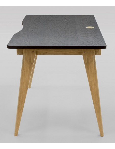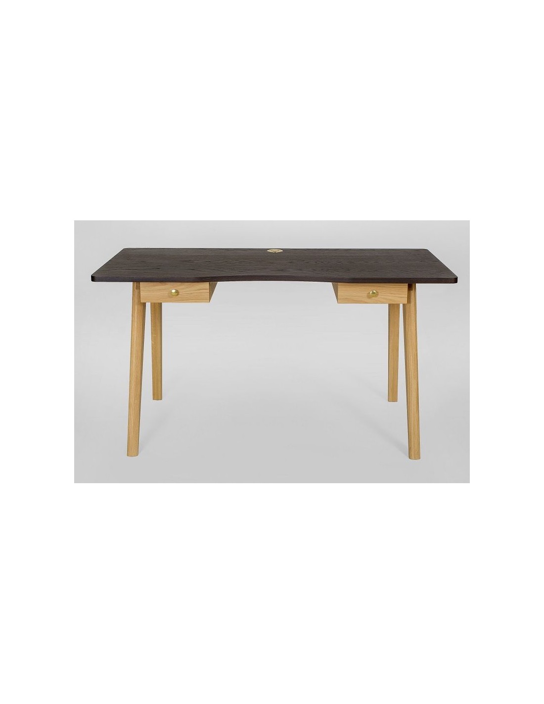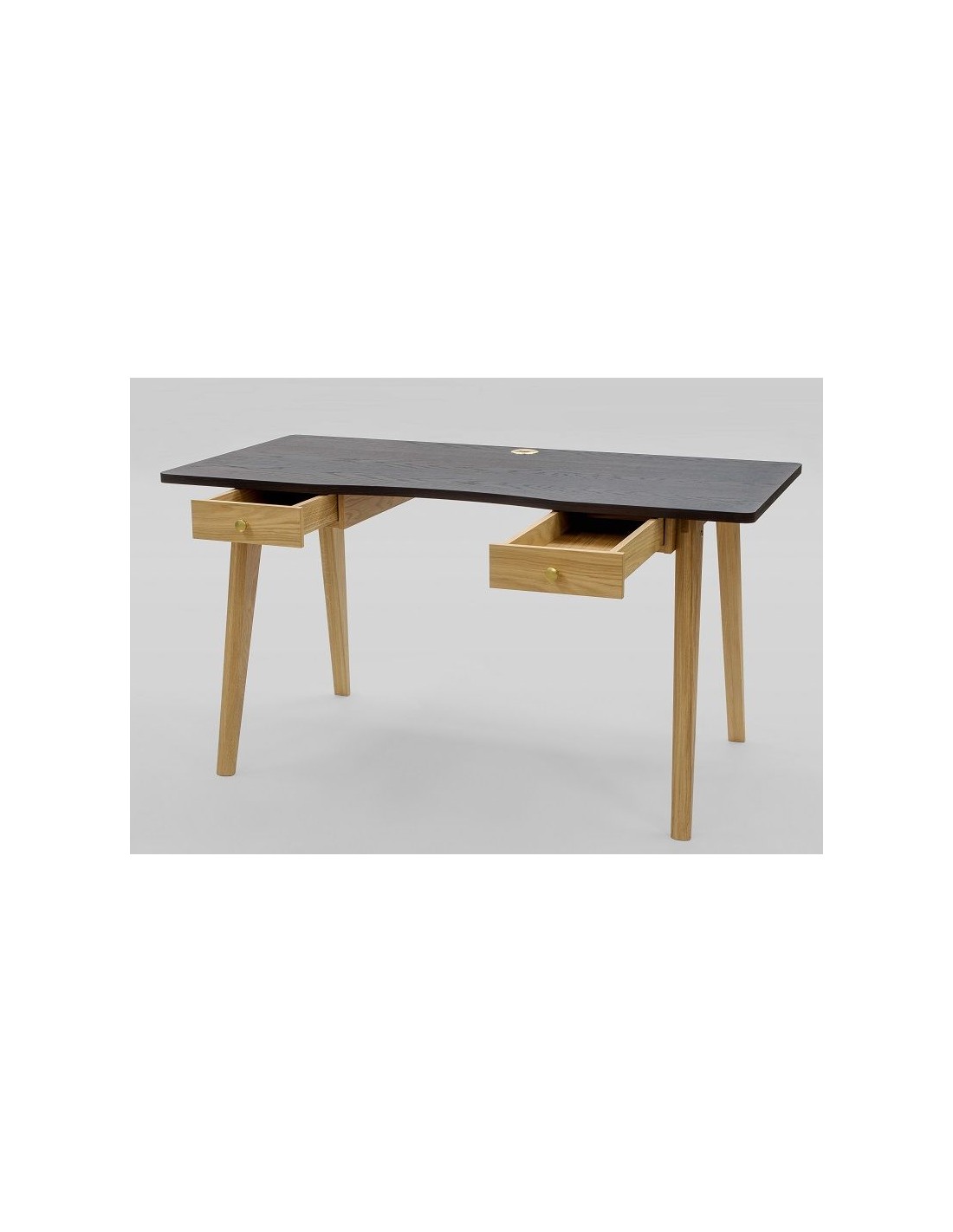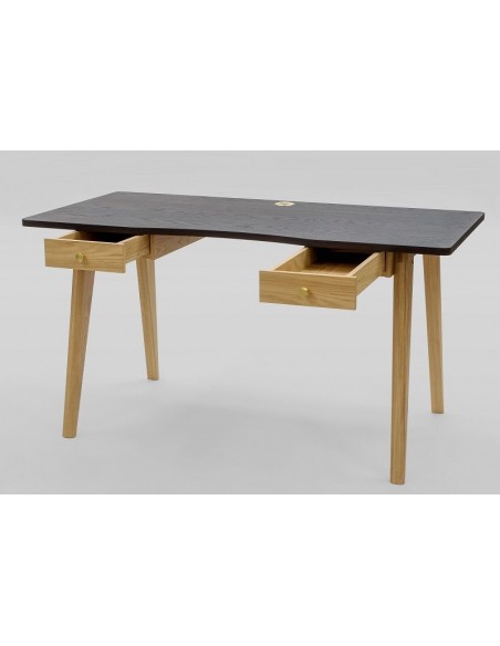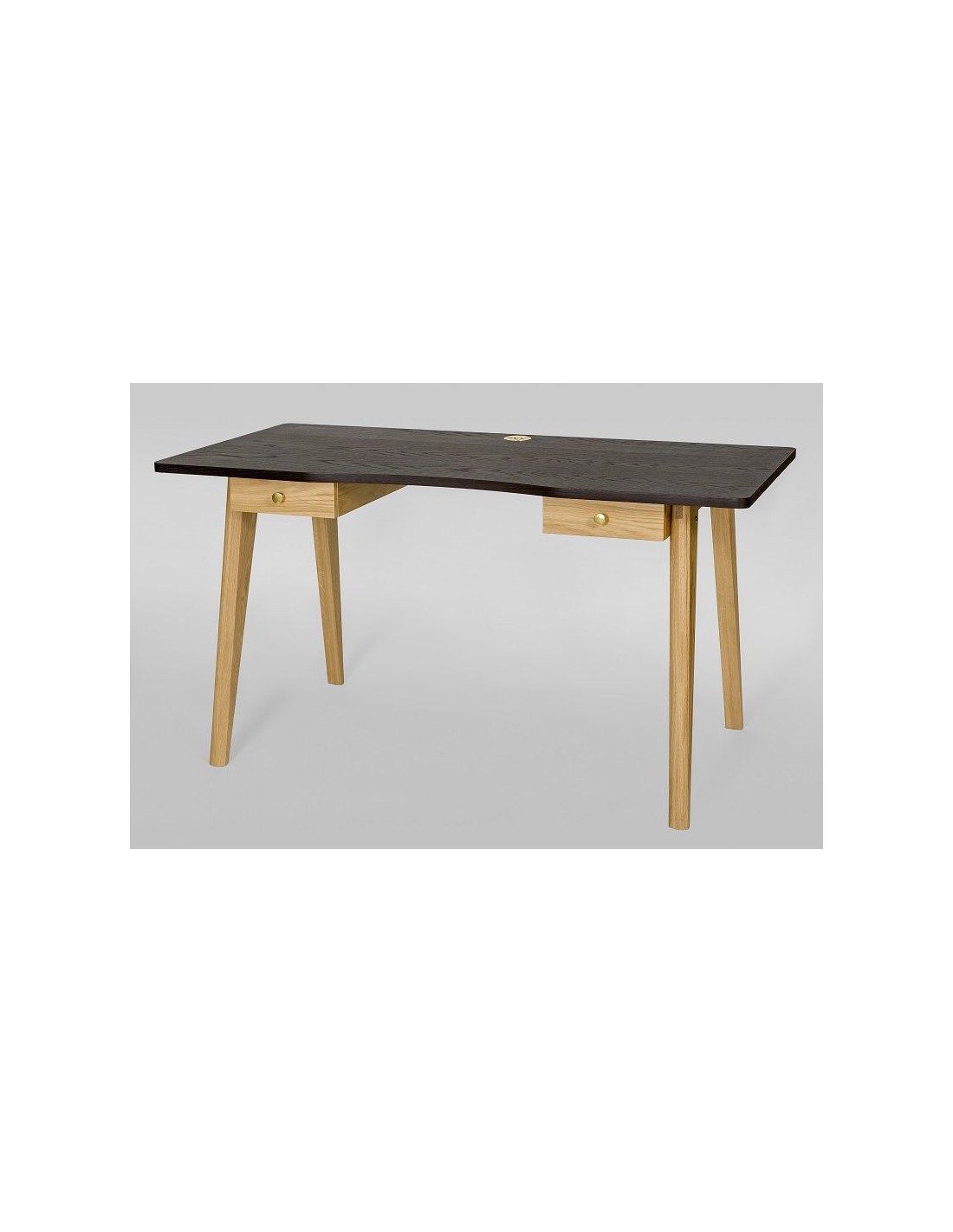 Skrivebord i et retro, men alligevel meget moderne design. Skrivebordet er udført i massiv eg og egefinér. Skrivebordet kommer med 2 skuffer og et kabelhul.