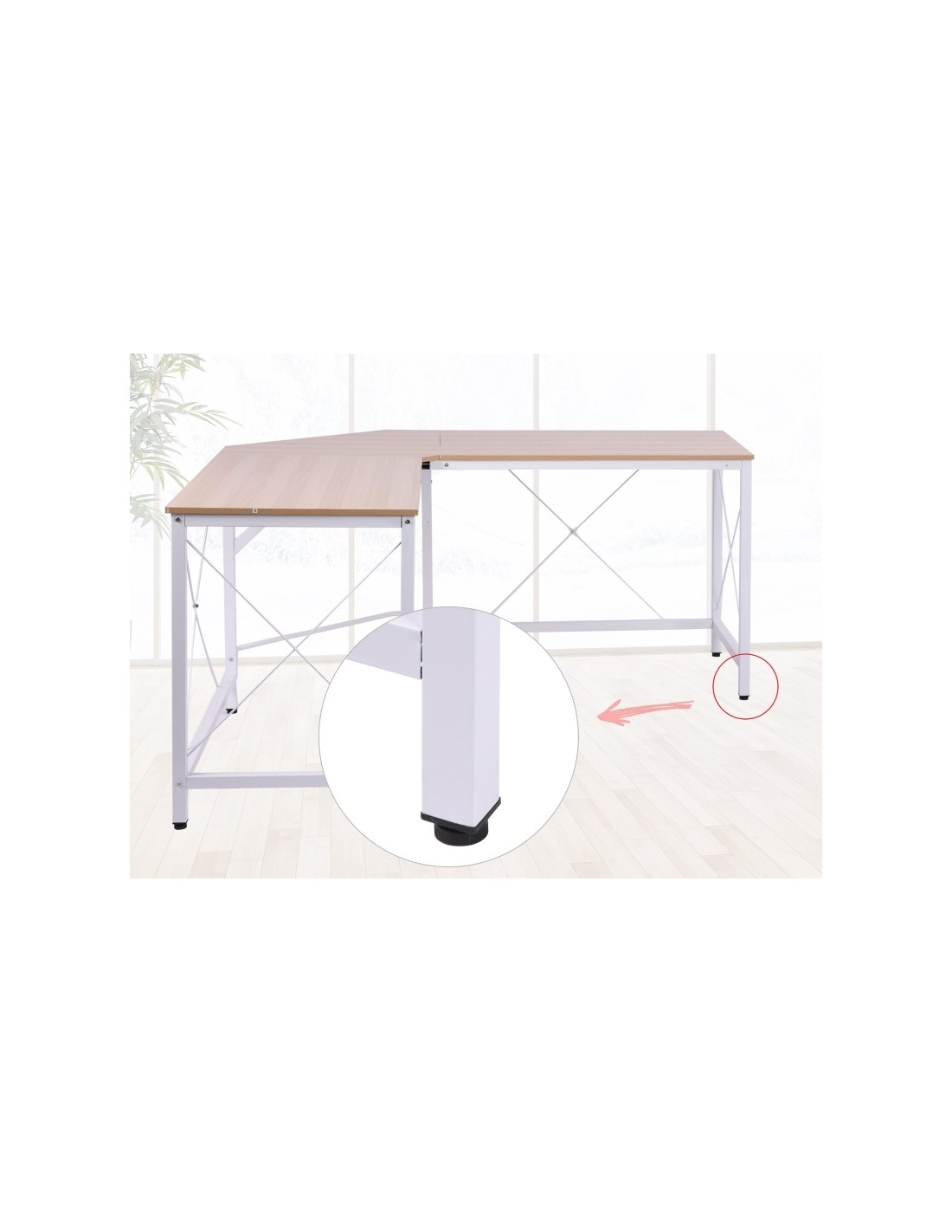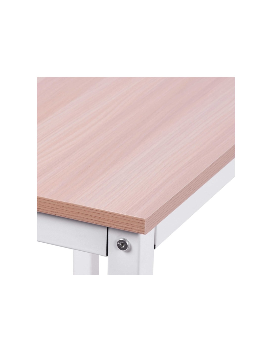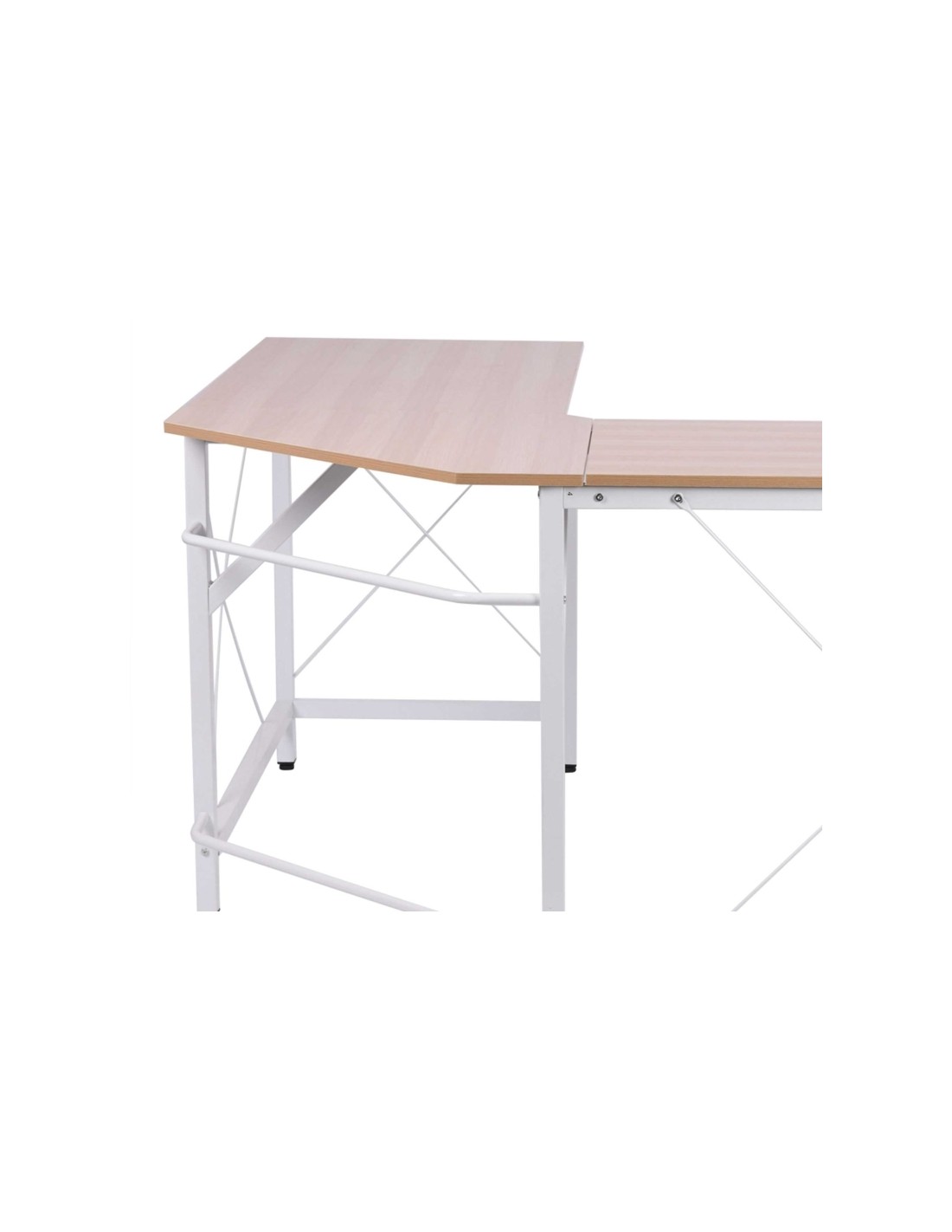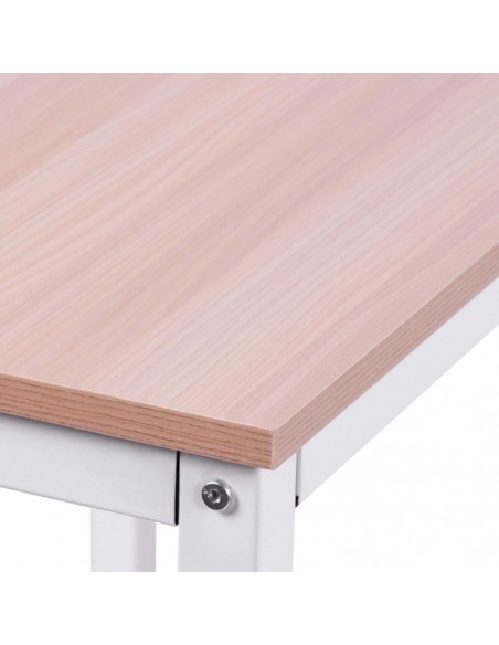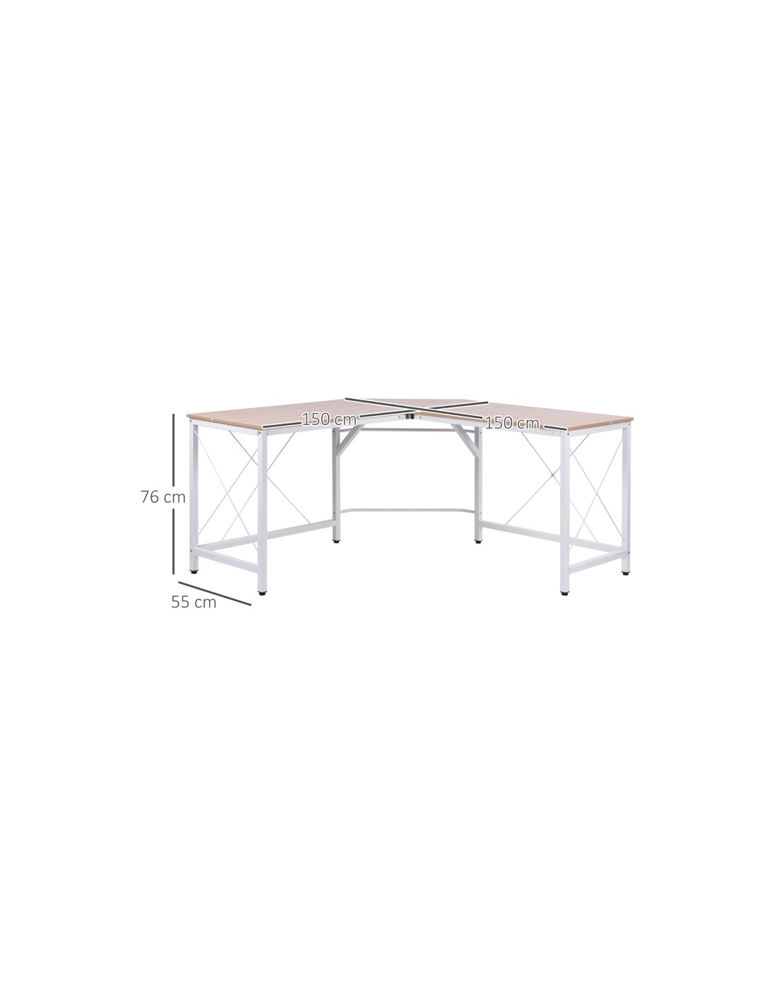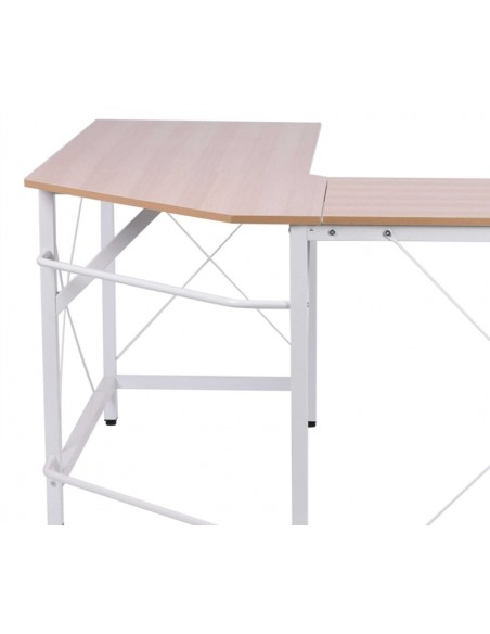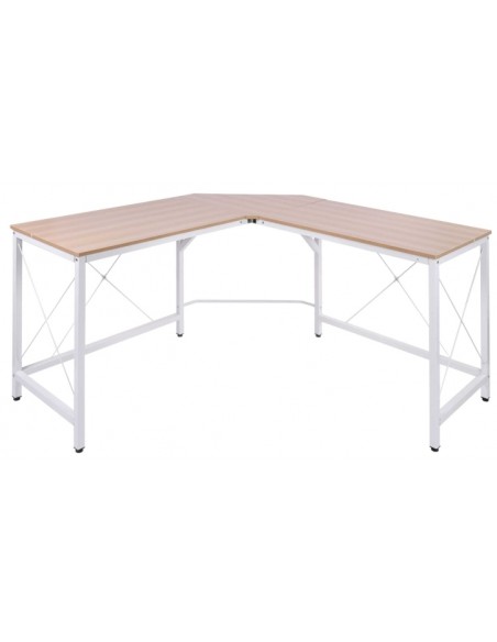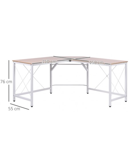 Hjørneskrivebord udført i et design af hvidlakeret metal og naturfarvet melamin. Skrivebordet måler 76 cm i højden og 150 x 150 cm i bredde og dybde.