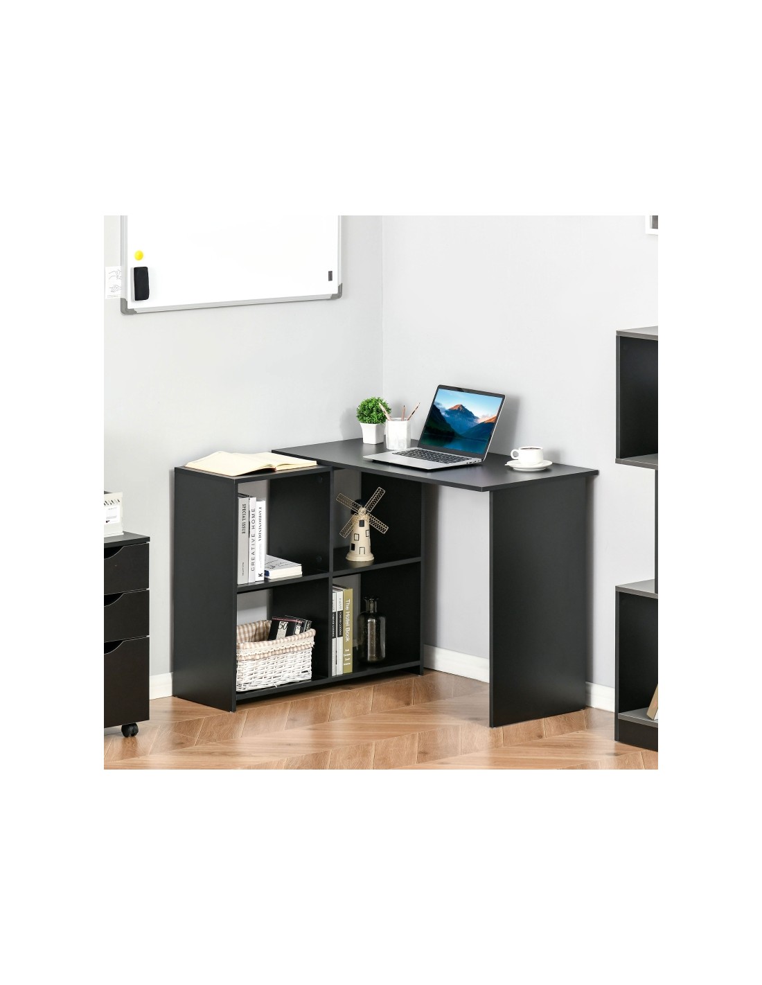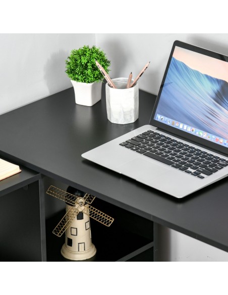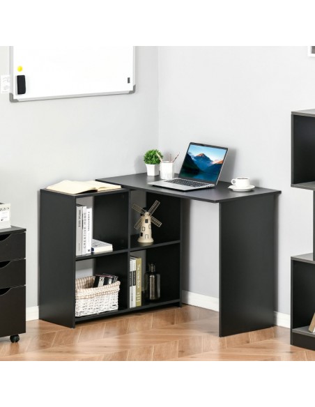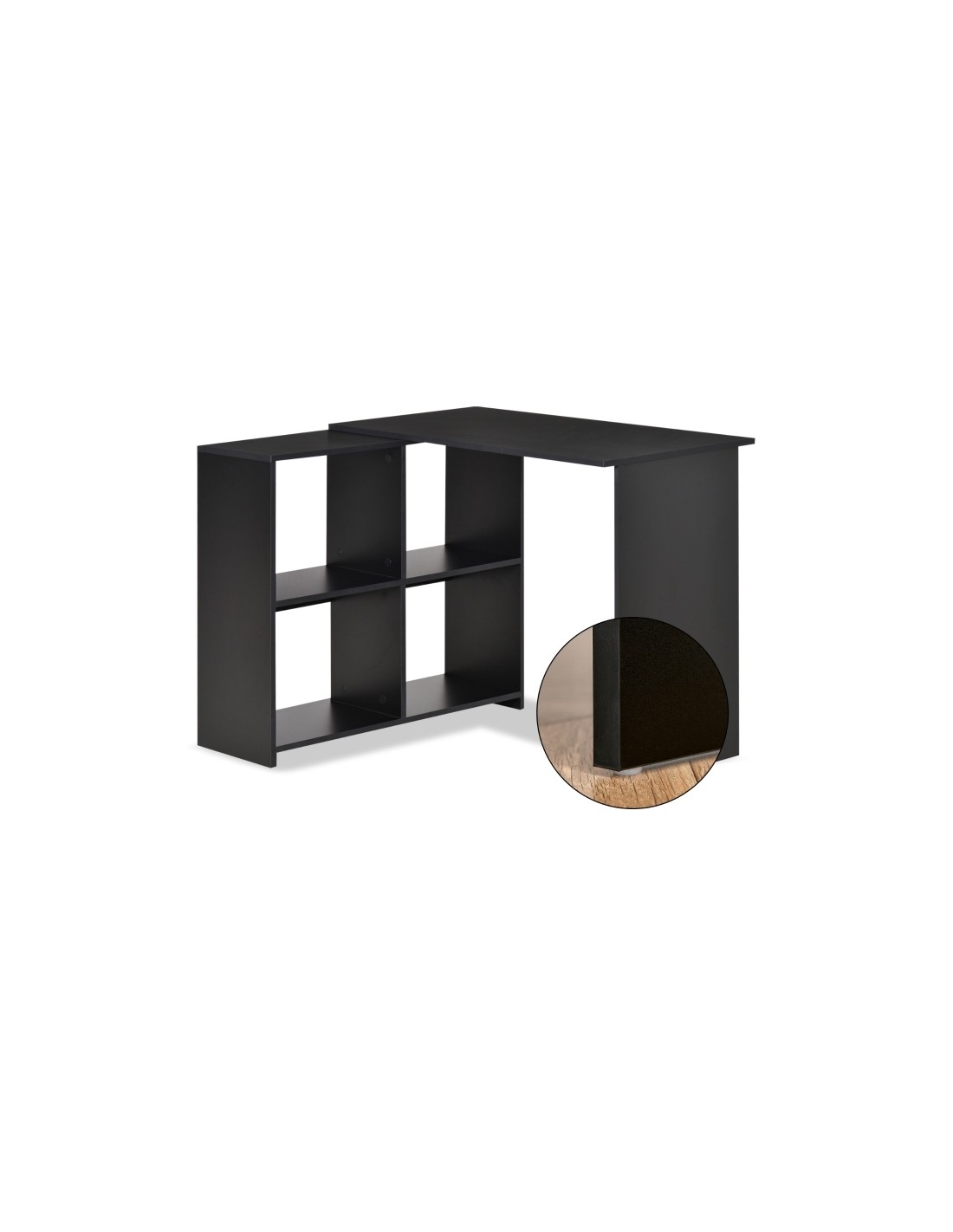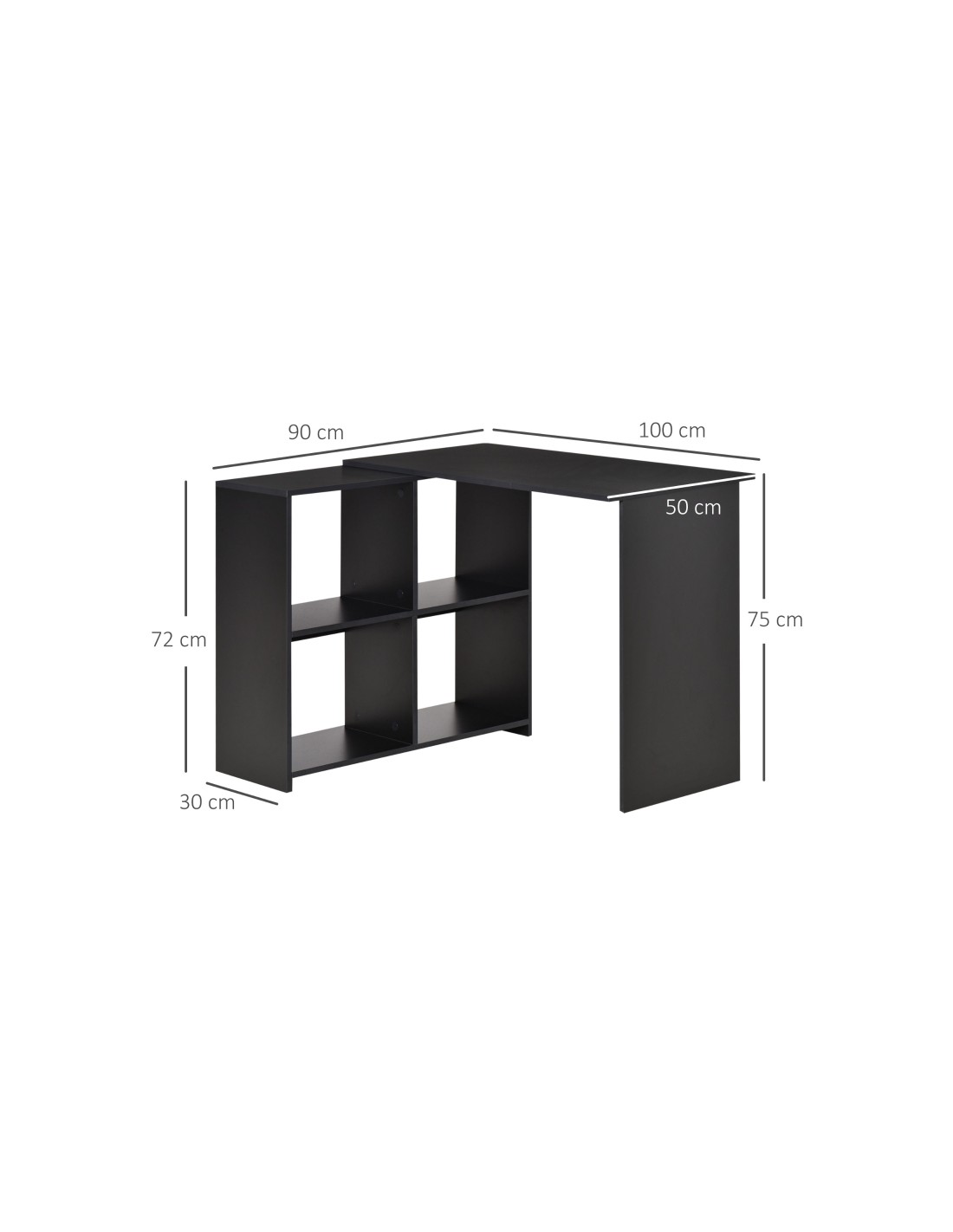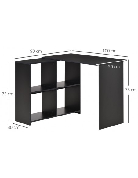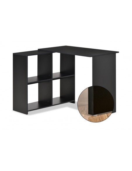 Hjørneskrivebord udført i et design af sort møbelplade. Skrivebordet måler 72 - 75 cm i højden og 100 x 90 cm i bredde og dybde.