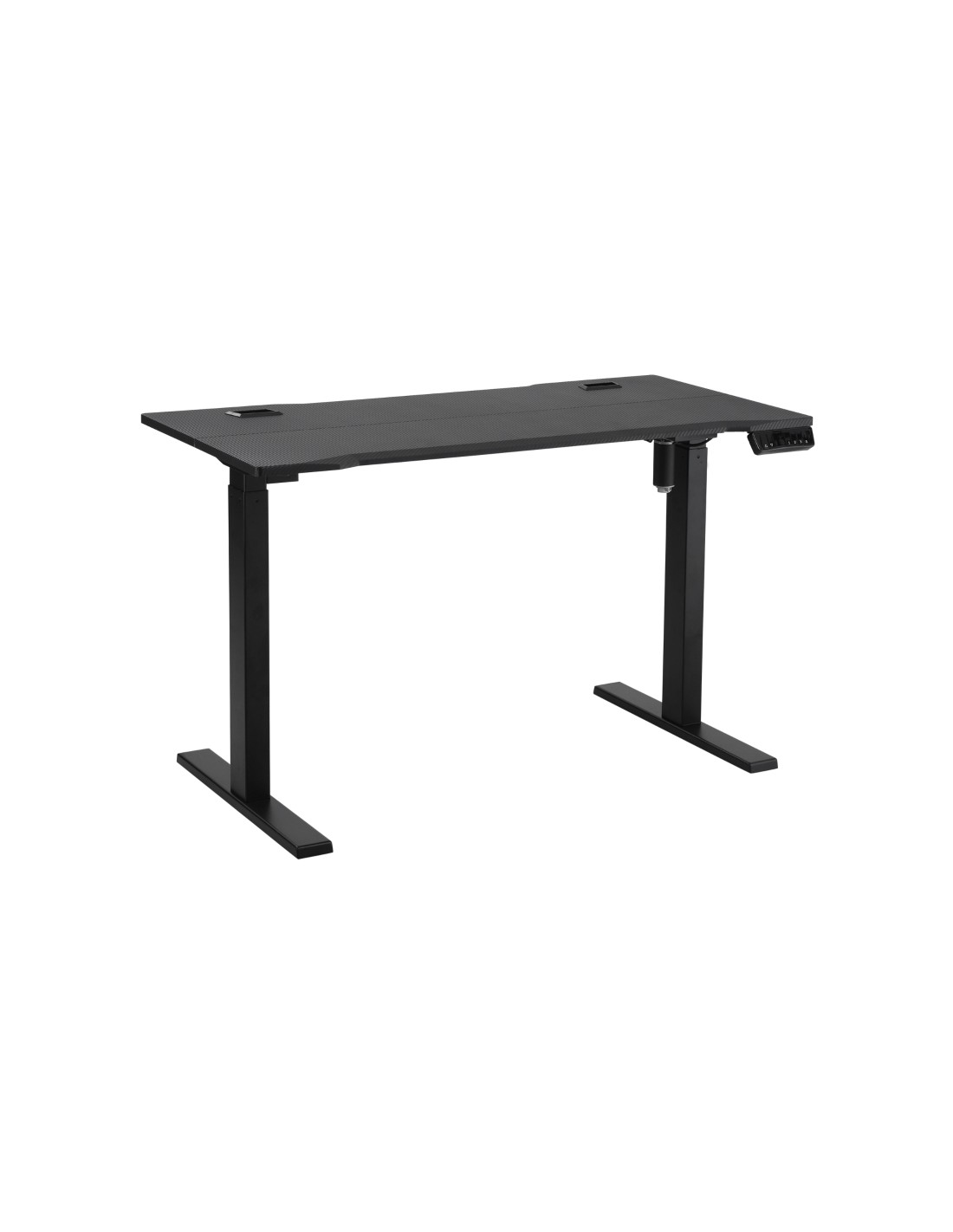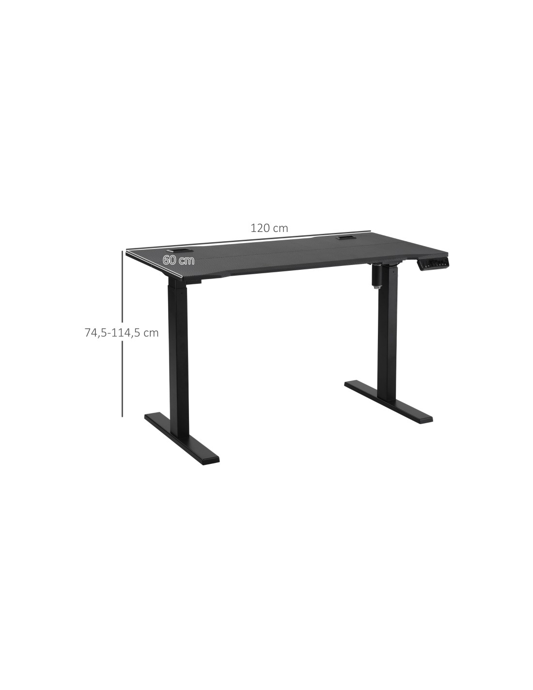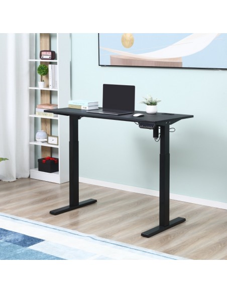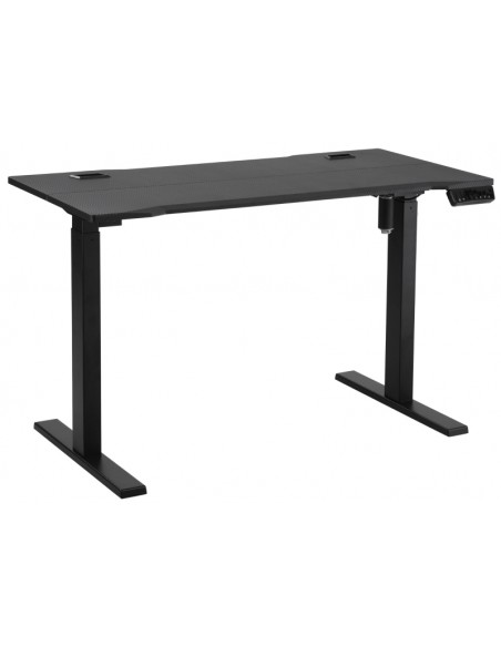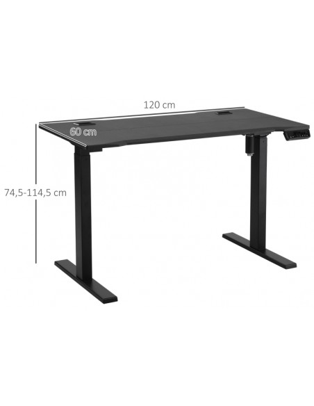 Hæve-/Sænke skrivebord udført i et design af sortlakeret metal og MDF. Skrivebordet måler 74,5 - 114,5 cm i højden og 120 x 60 cm i bredde og dybde.