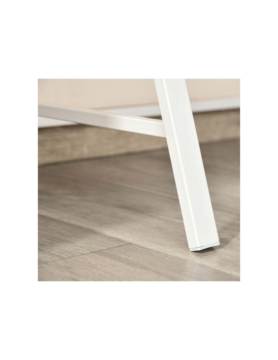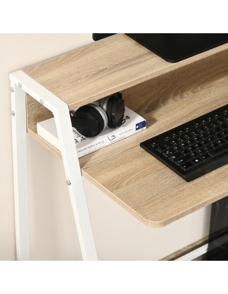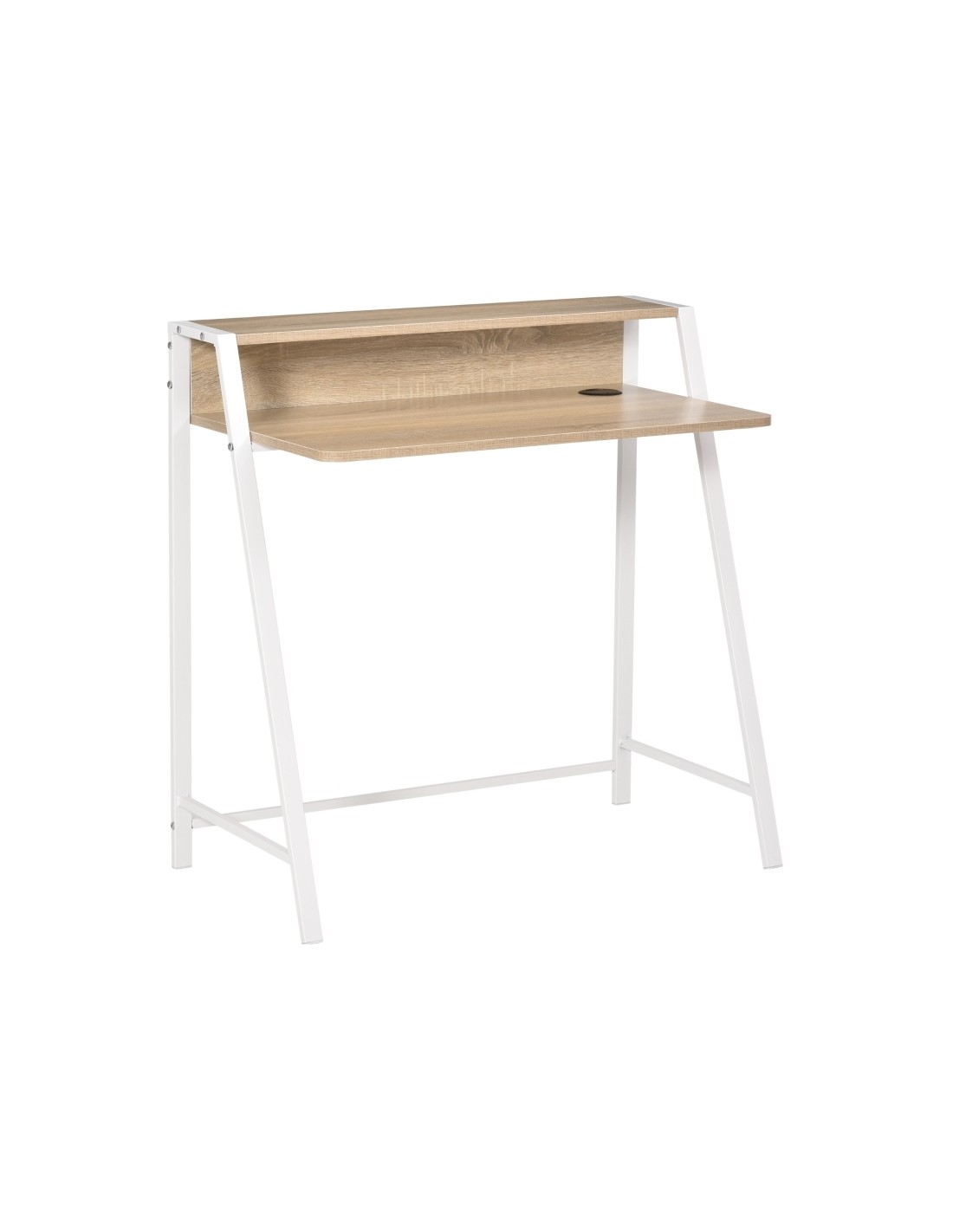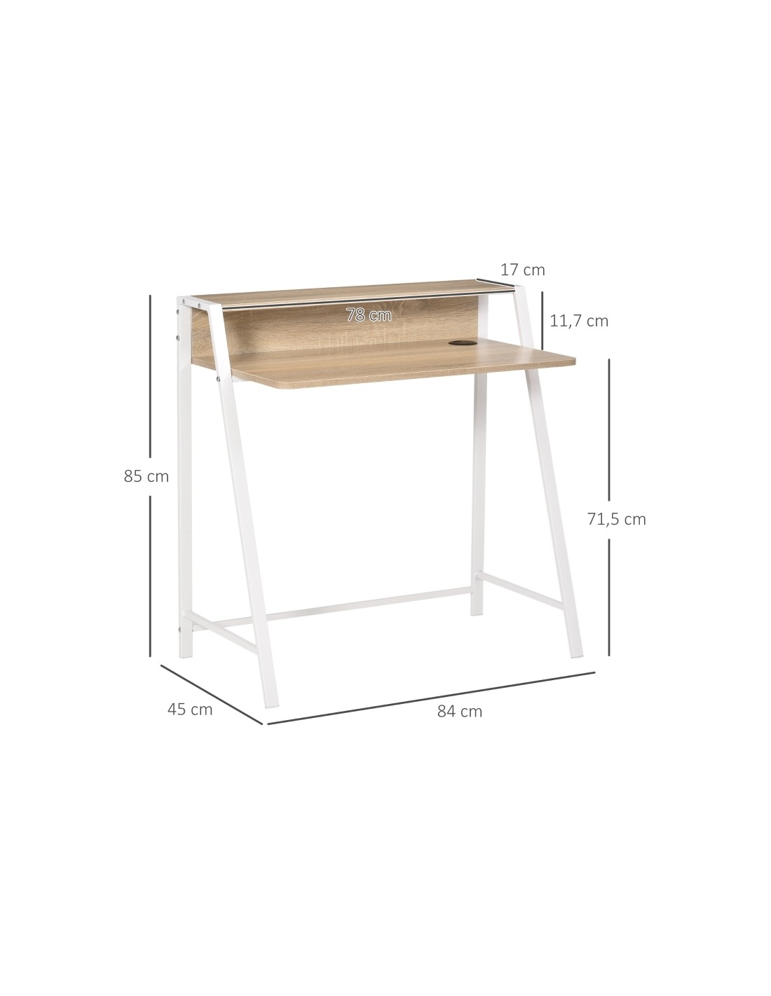 Skrivebord udført i et design af hvidlakeret metal og naturfarvet MDF. Skrivebordet måler 85 cm i højden og 84 x 45 cm i bredde og dybde. Højden på bordpladen måler 71,5 cm.