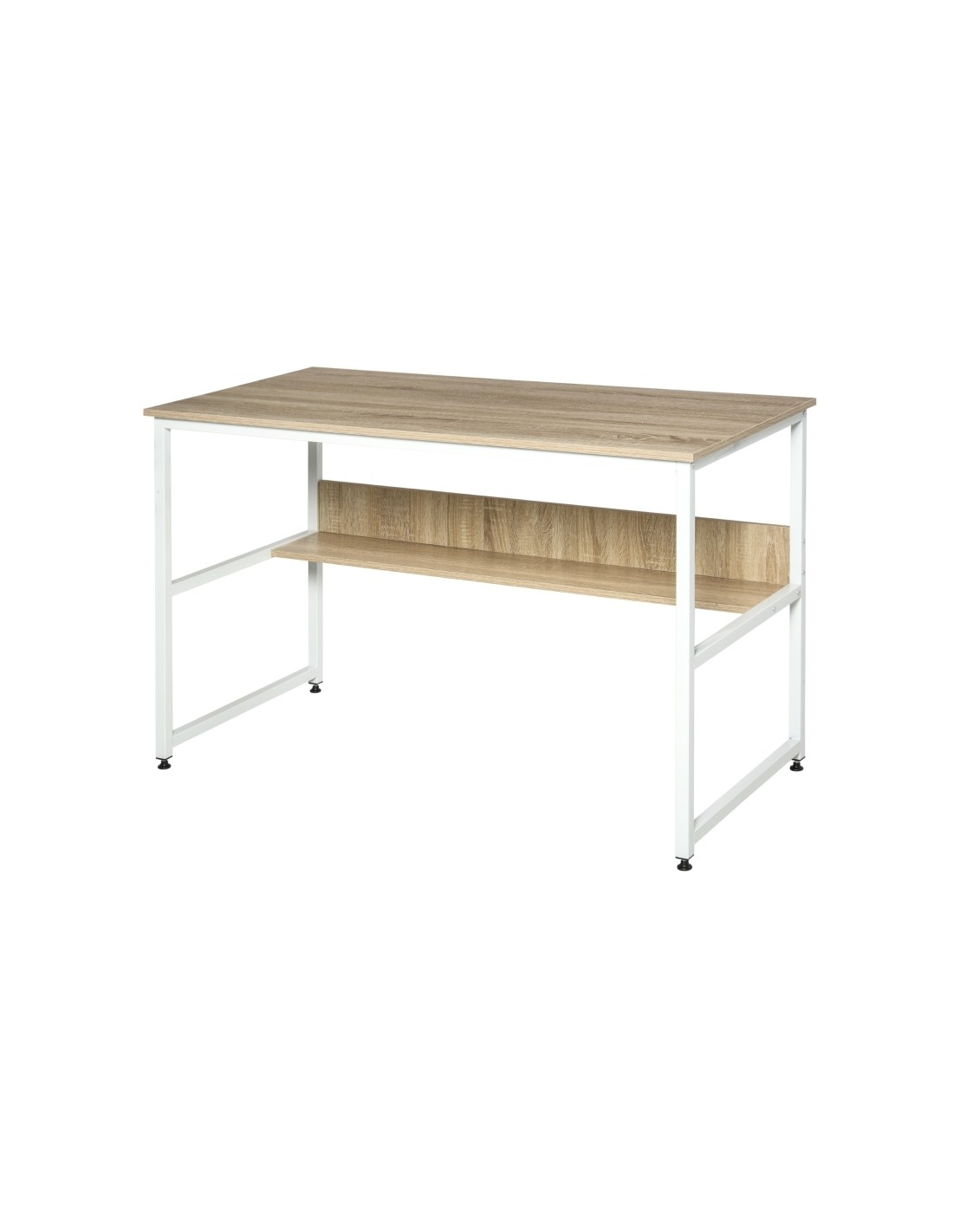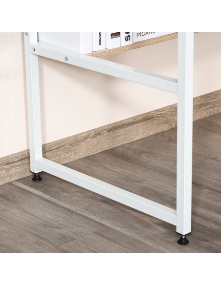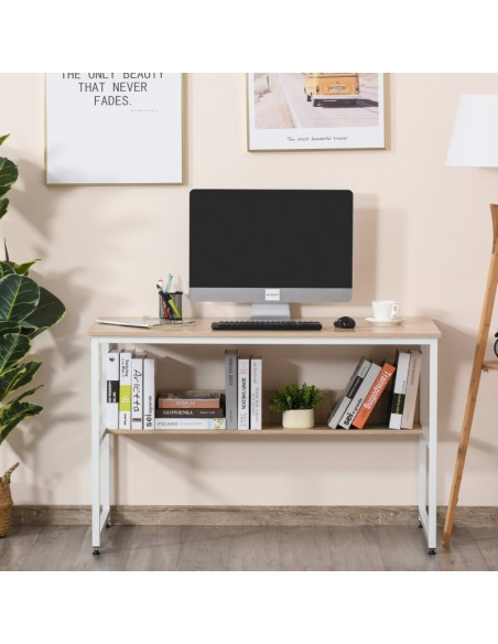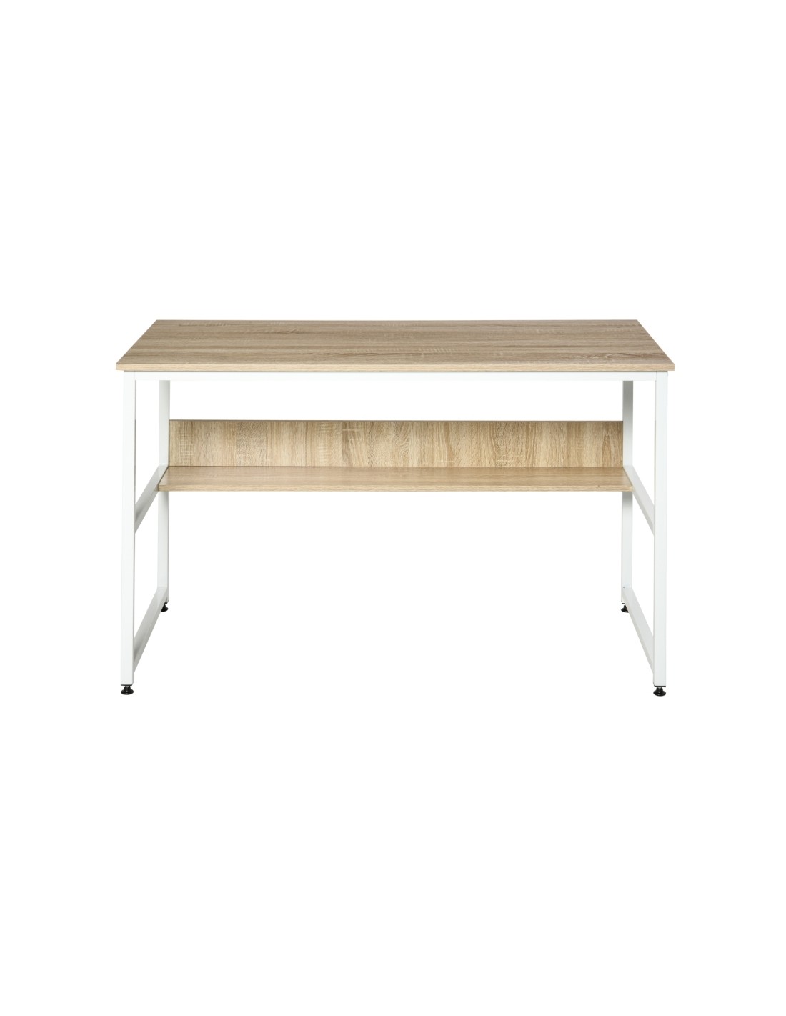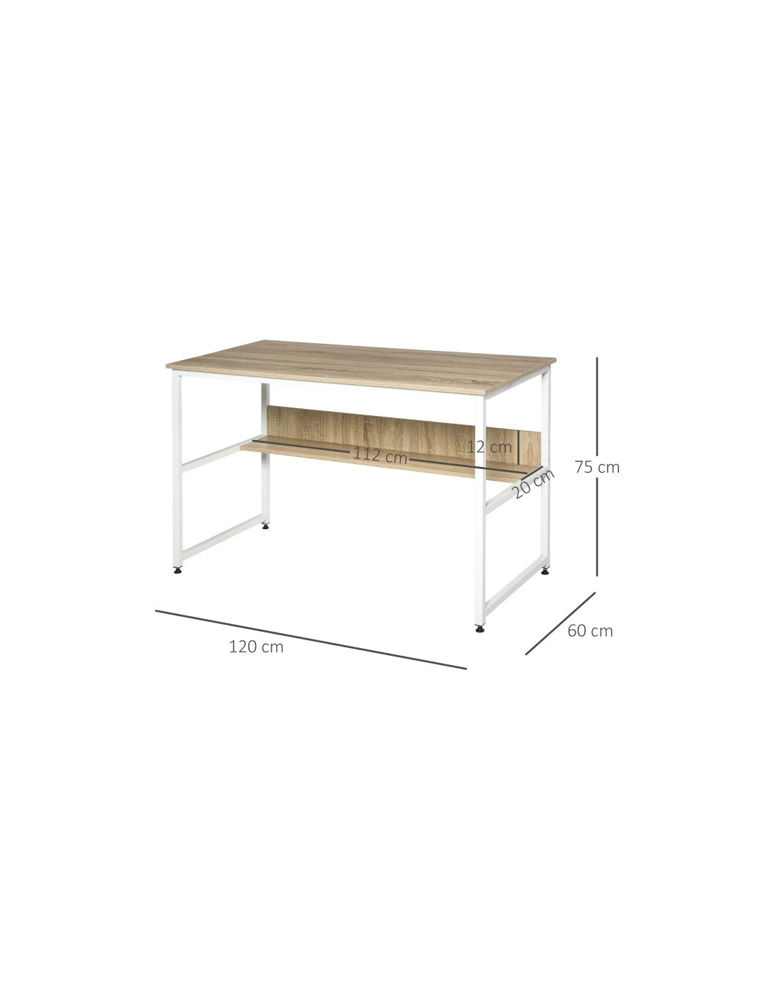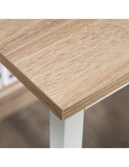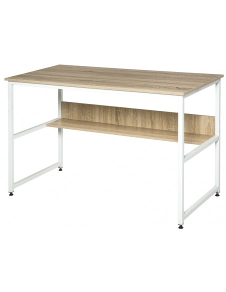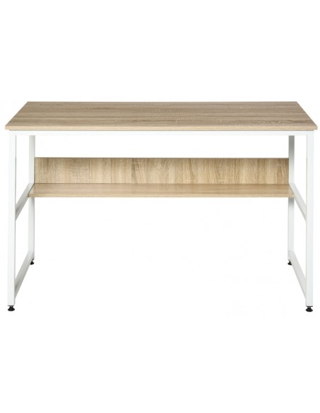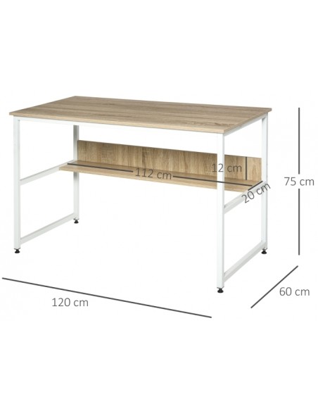 Skrivebord udført i et design af hvidlakeret metal og naturfarvet møbelplade. Skrivebordet måler 75 cm i højden og 120 x 60 cm i bredde og dybde.