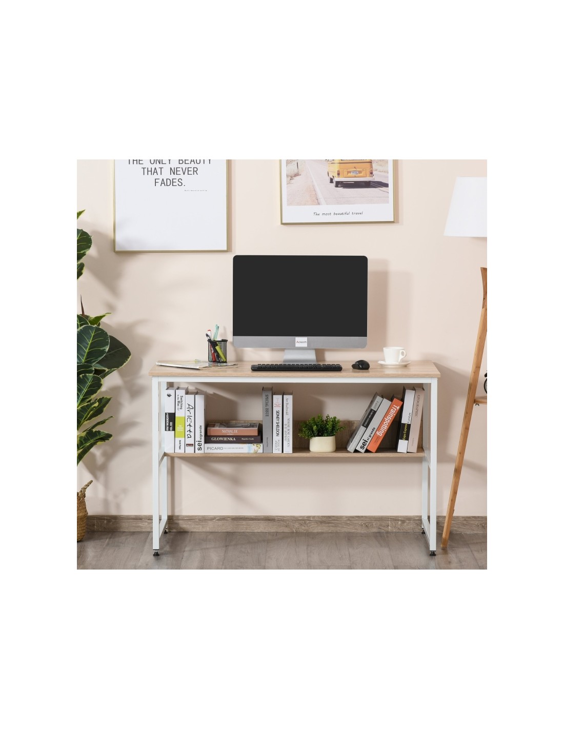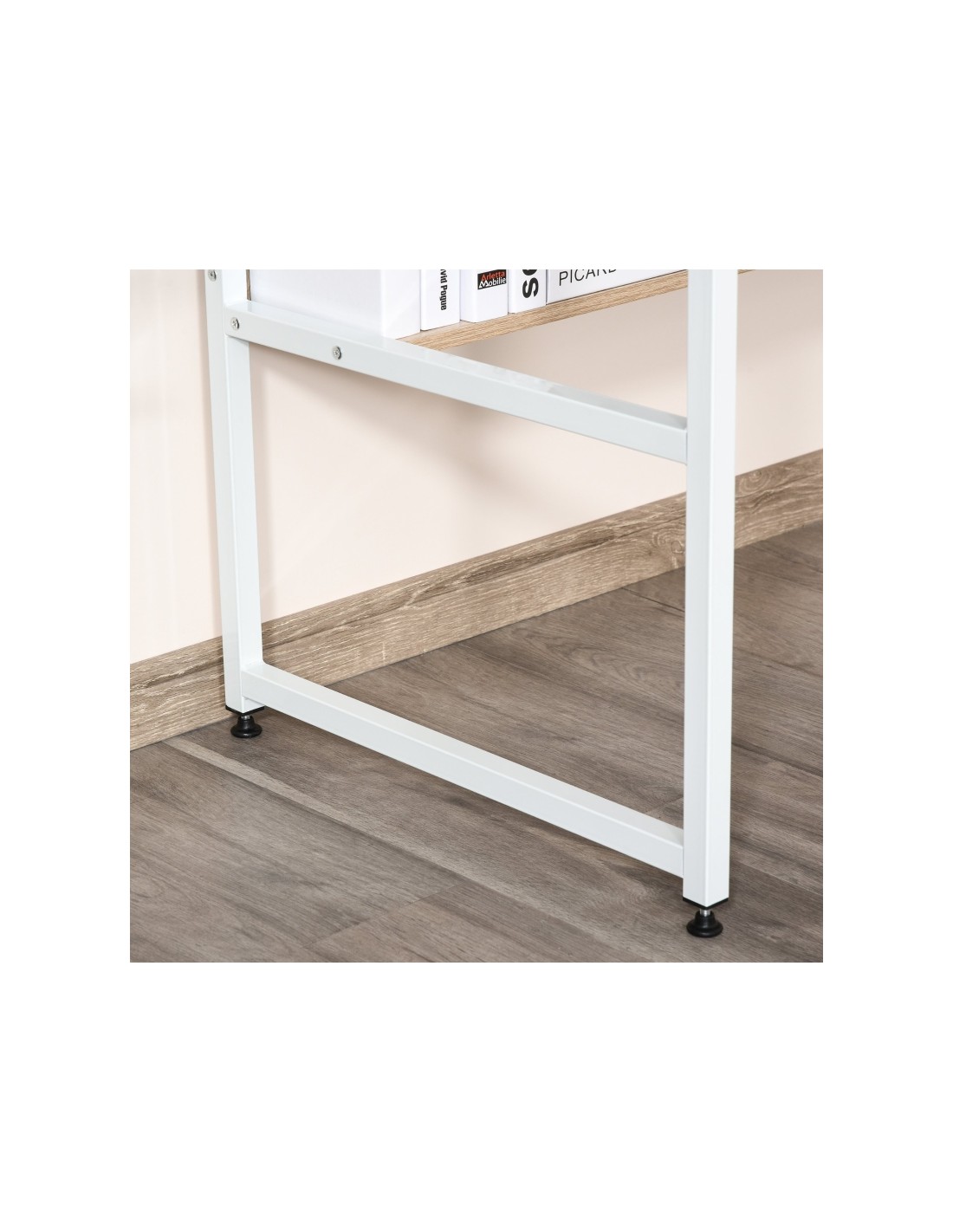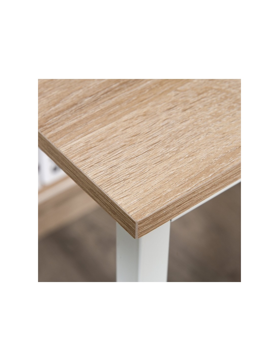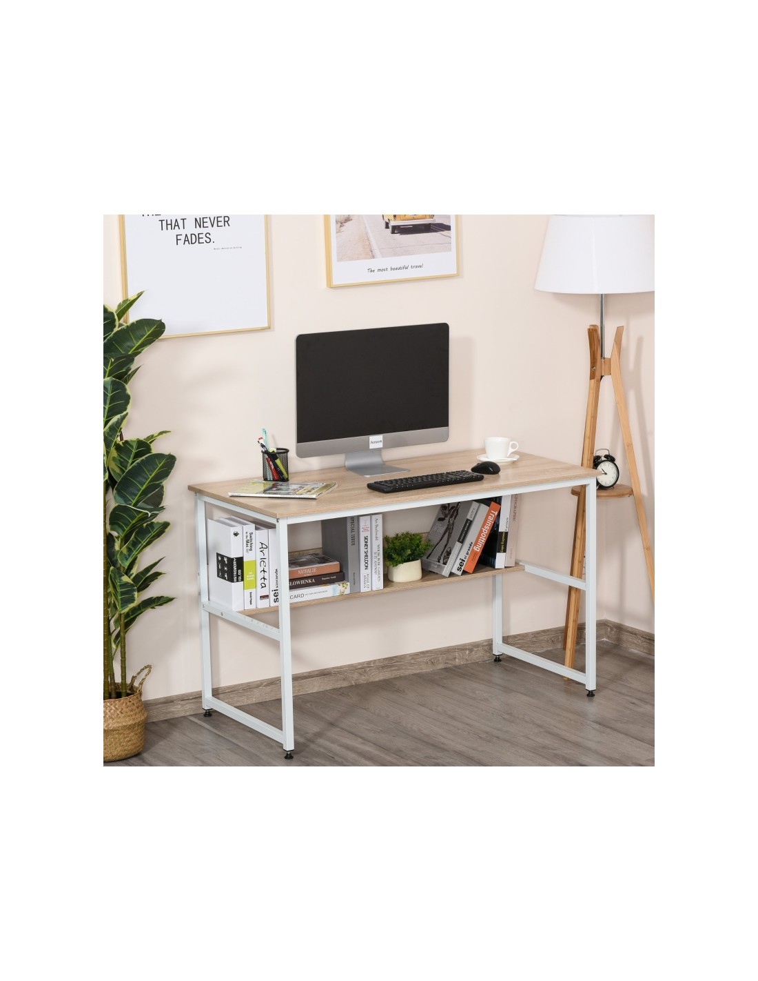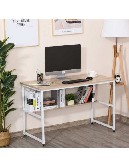 Skrivebord udført i et design af hvidlakeret metal og naturfarvet møbelplade. Skrivebordet måler 75 cm i højden og 120 x 60 cm i bredde og dybde.