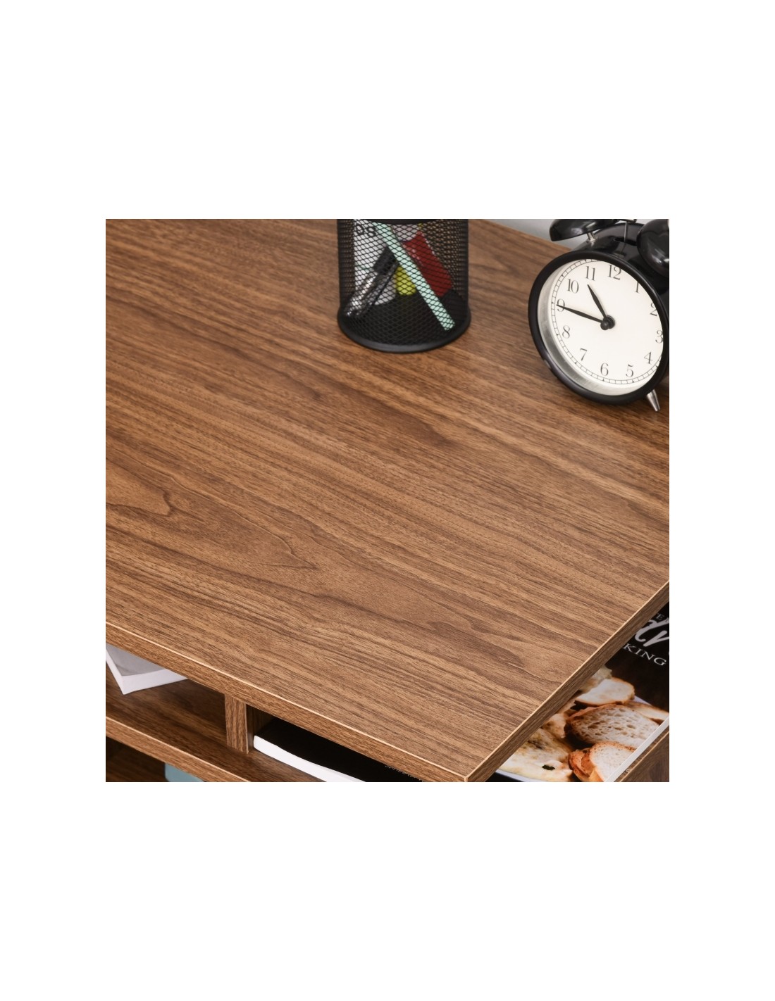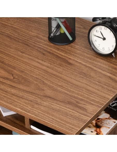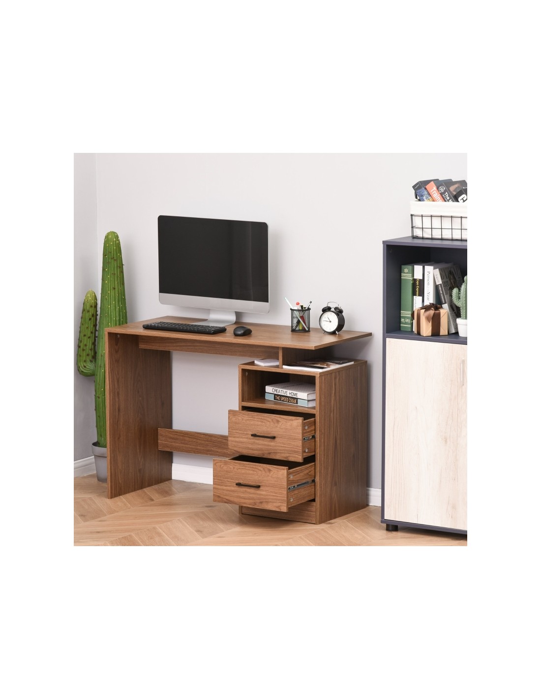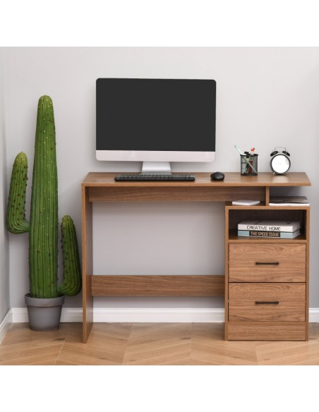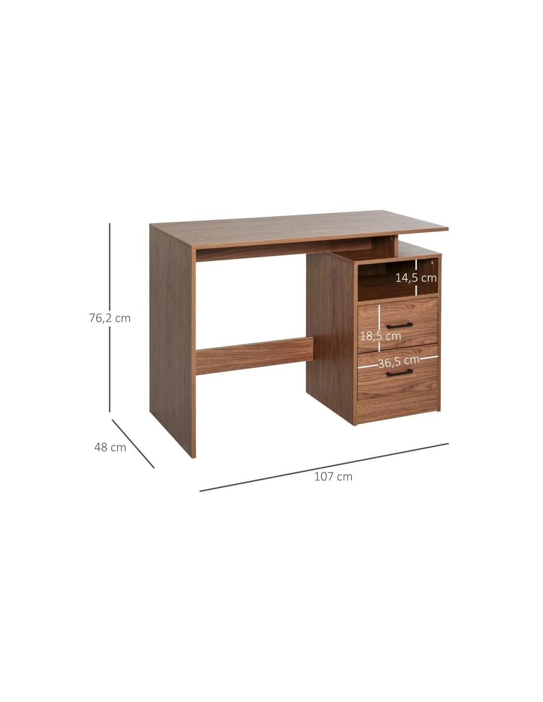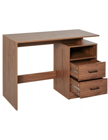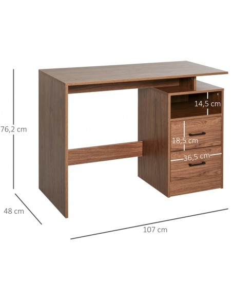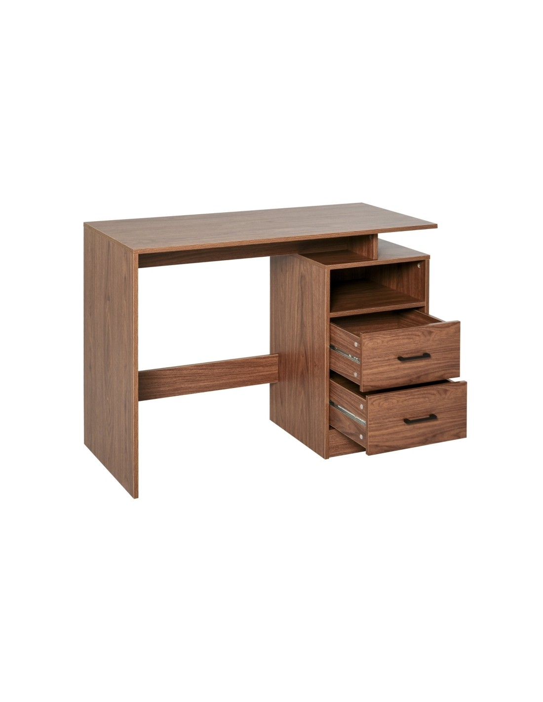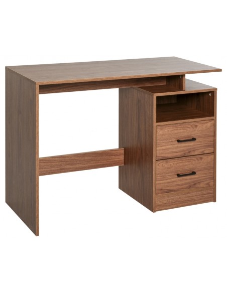 Skrivebord udført i et design af nøddefarvet møbelplade. Skrivebordet måler 76,2 cm i højden og 107 x 48 cm i bredde og dybde. Skrivebordet indeholder 1 åbent hylderum samt 2 skuffer.
