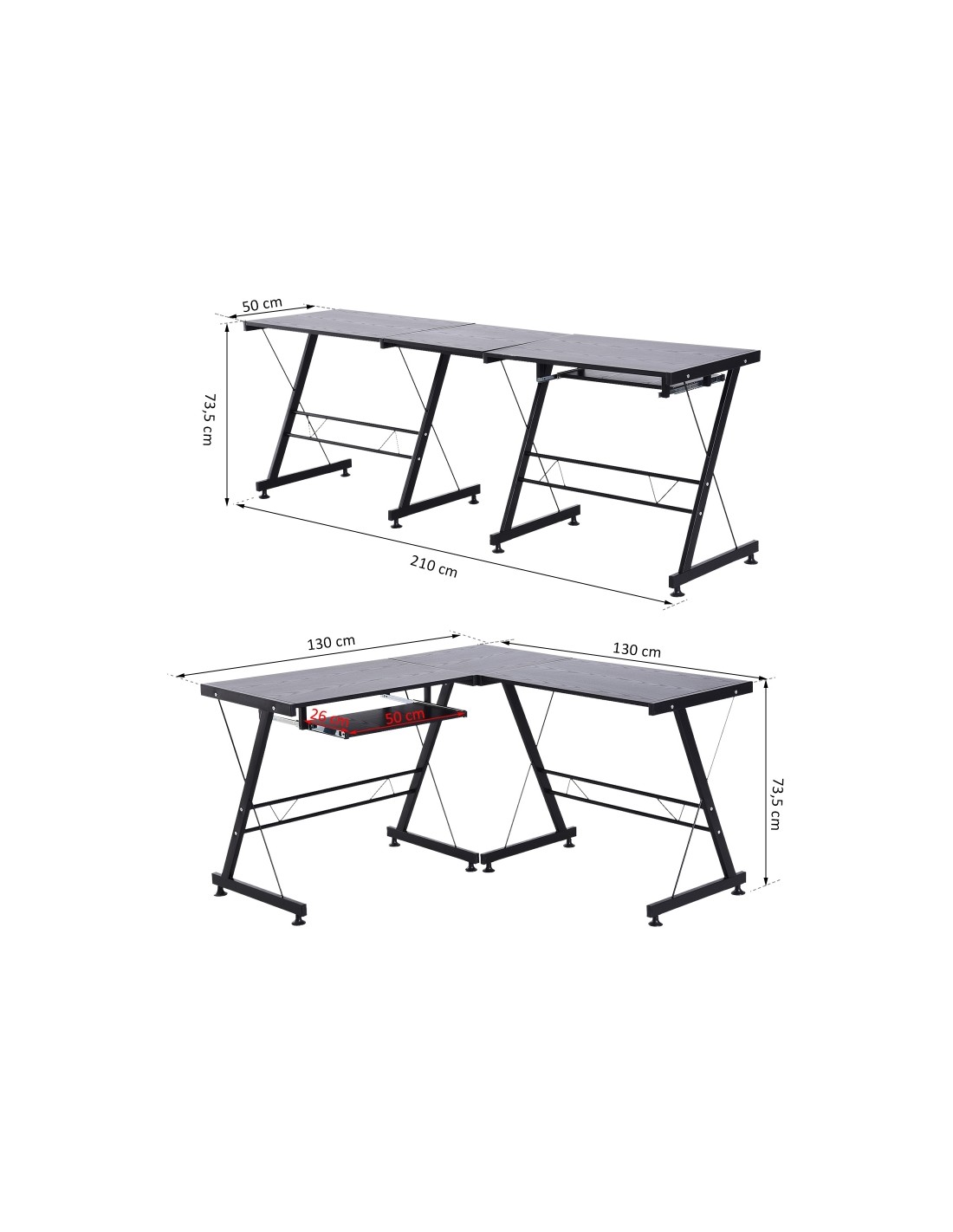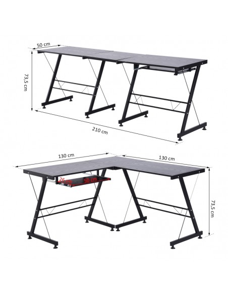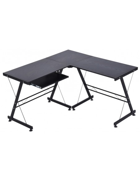 Hjørneskrivebord udført i et design af sortlakeret metal og sort MDF. Skrivebordet måler 73,5 cm i højden og 130 x 130 cm i bredde og dybde.