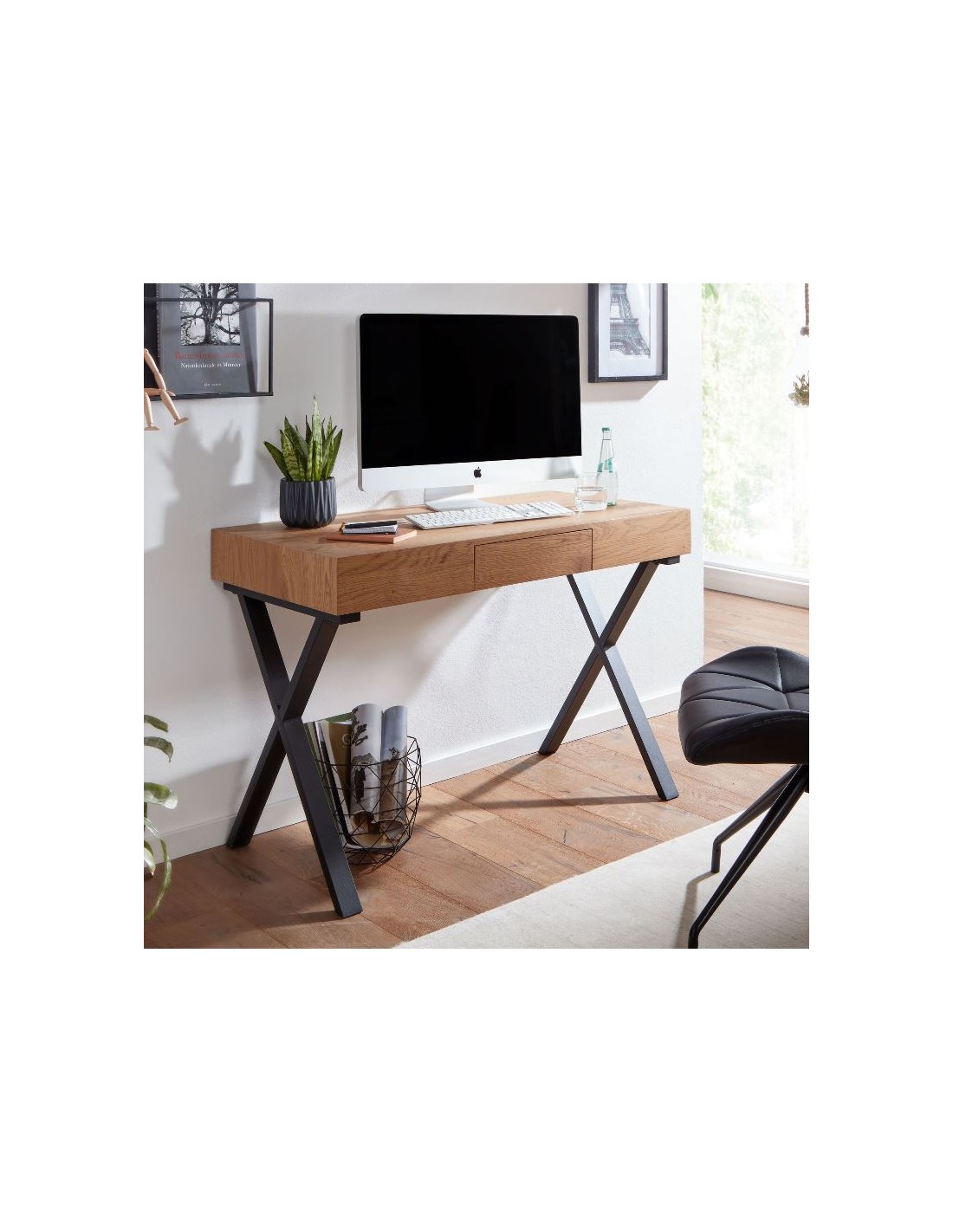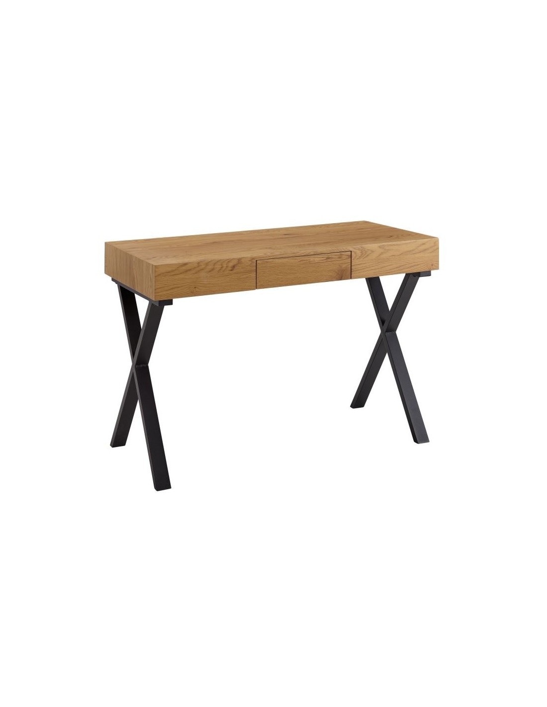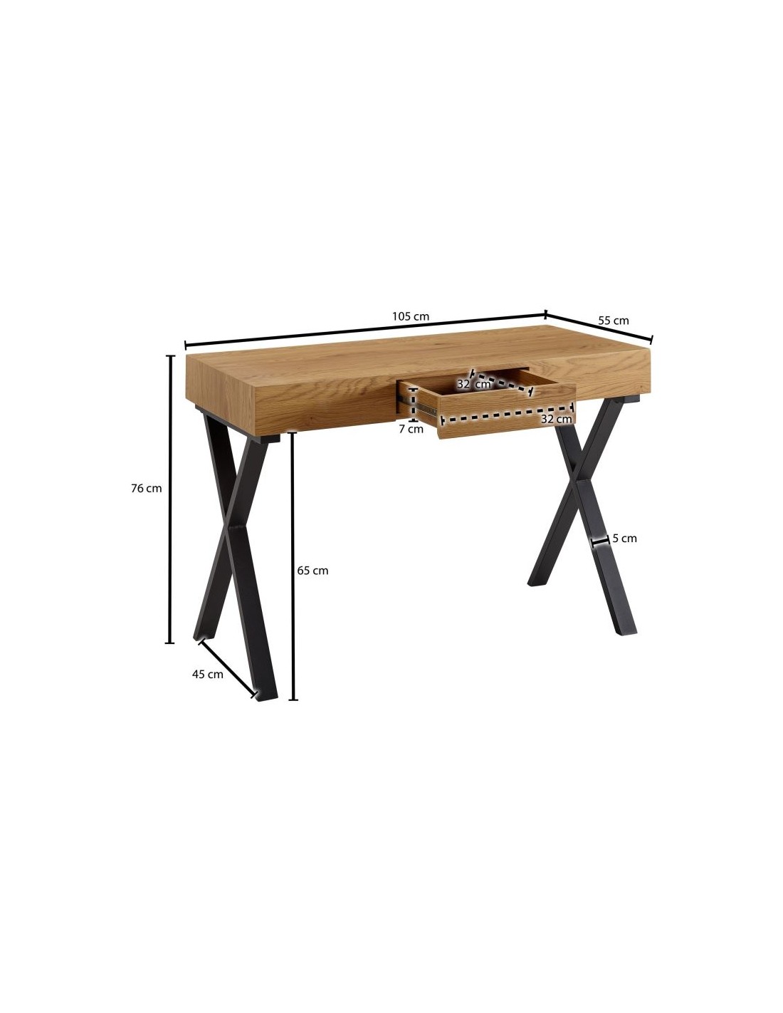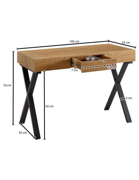 Skrivebord fremstillet i et design af sortlakeret metal og egetræsfarvet mdf. Bordet måler 76 cm i højden og 105 x 55 cm i bredde og dybde.