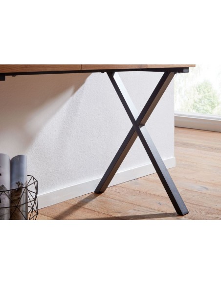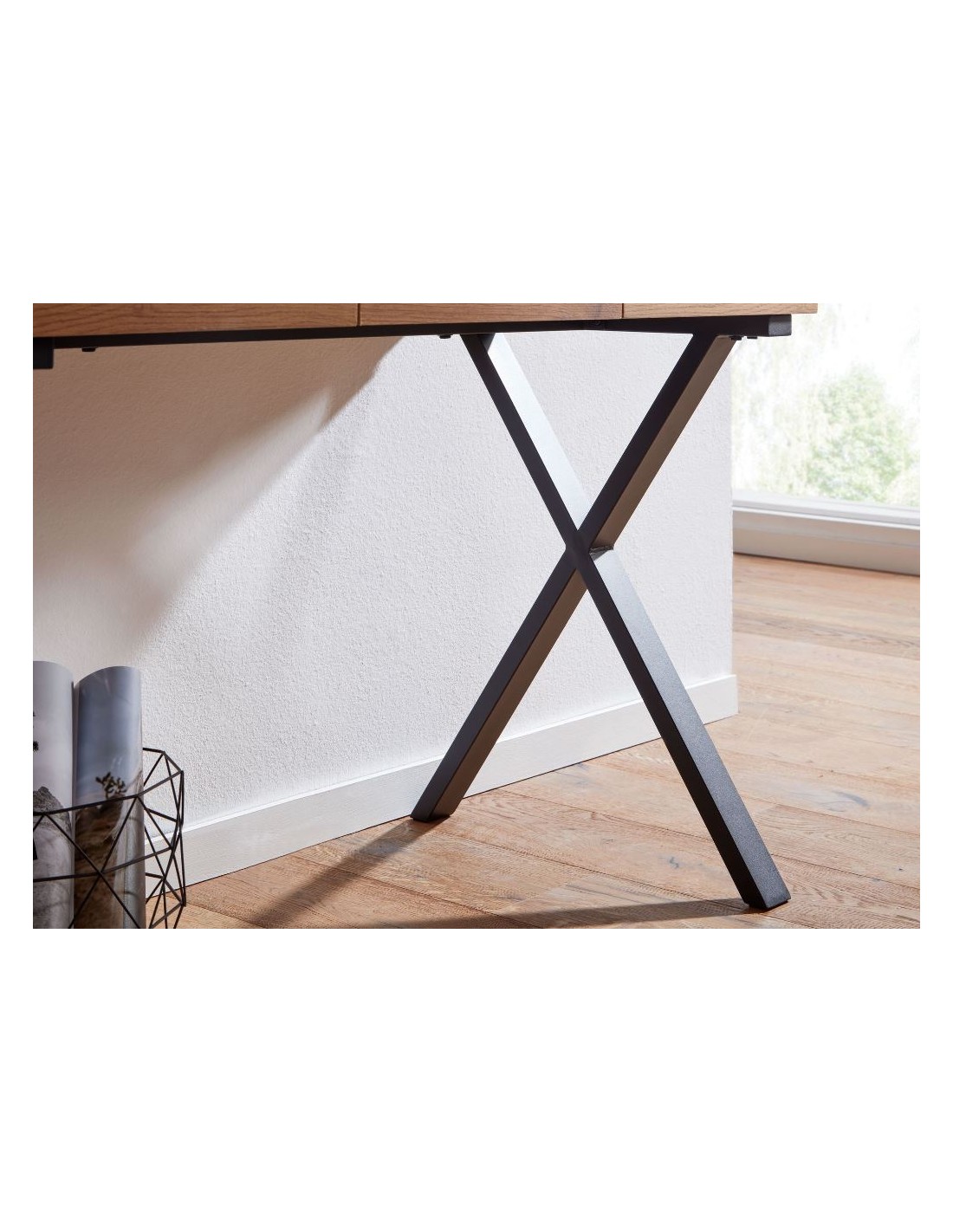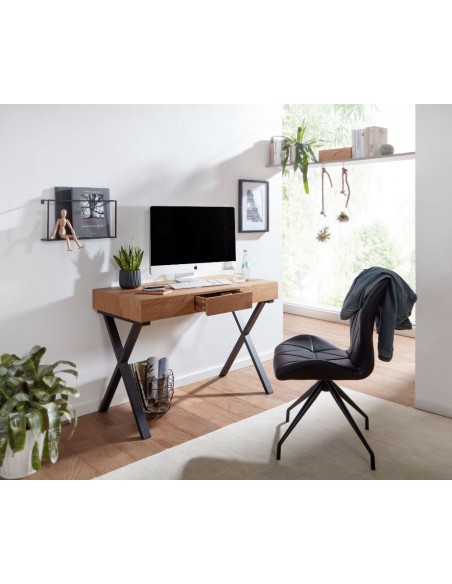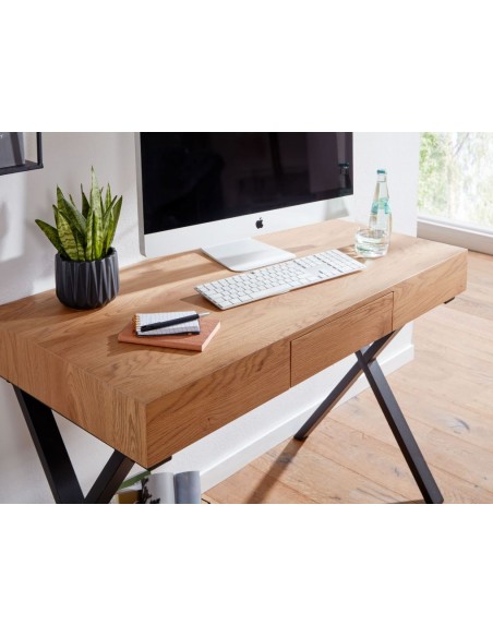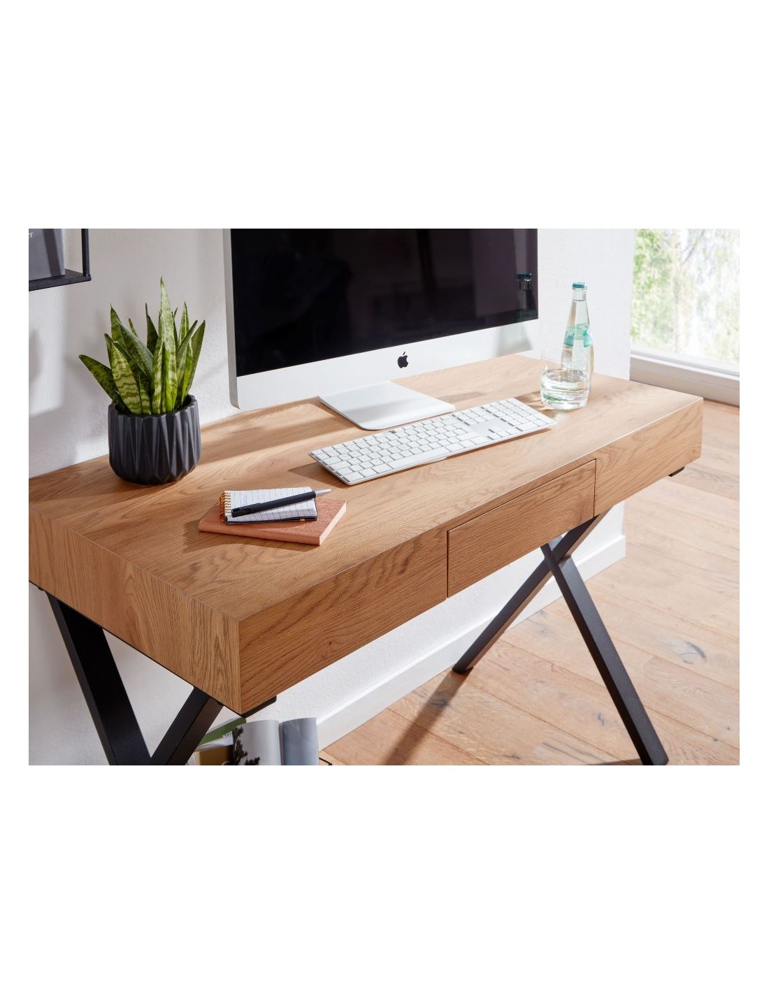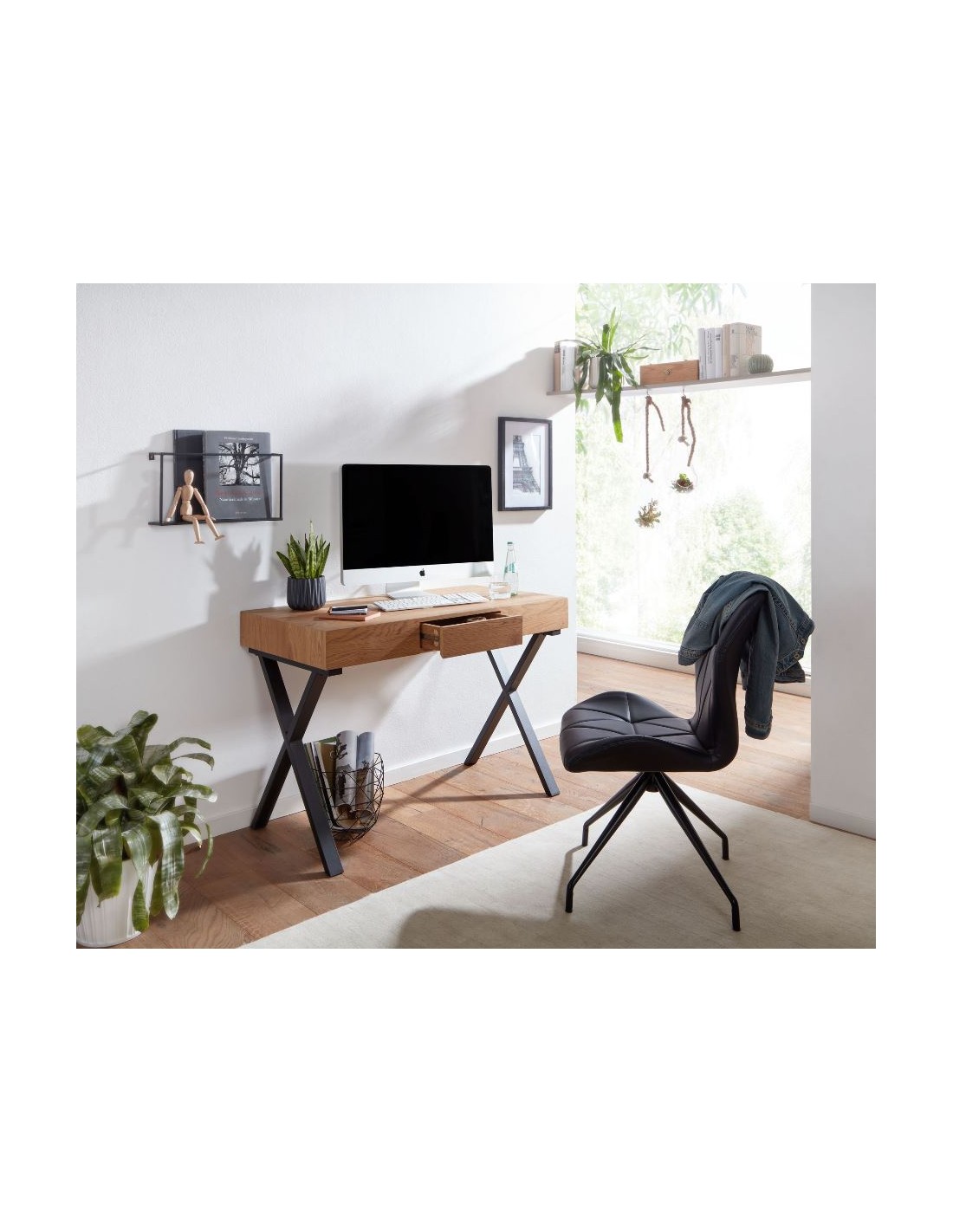 Skrivebord fremstillet i et design af sortlakeret metal og egetræsfarvet mdf. Bordet måler 76 cm i højden og 105 x 55 cm i bredde og dybde.
