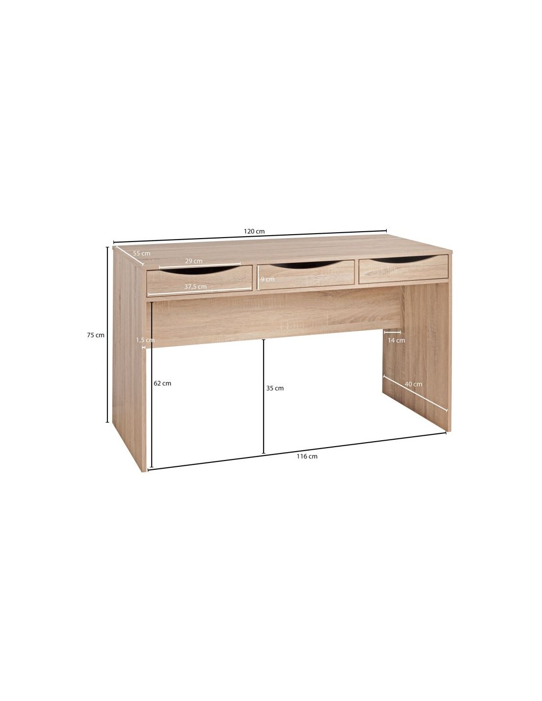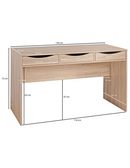 Skrivebord fremstillet i et design af sonoma egetræsfarvet møbelplade. Bordet måler 75 cm i højden og 120 x 55 cm i bredde og dybde.