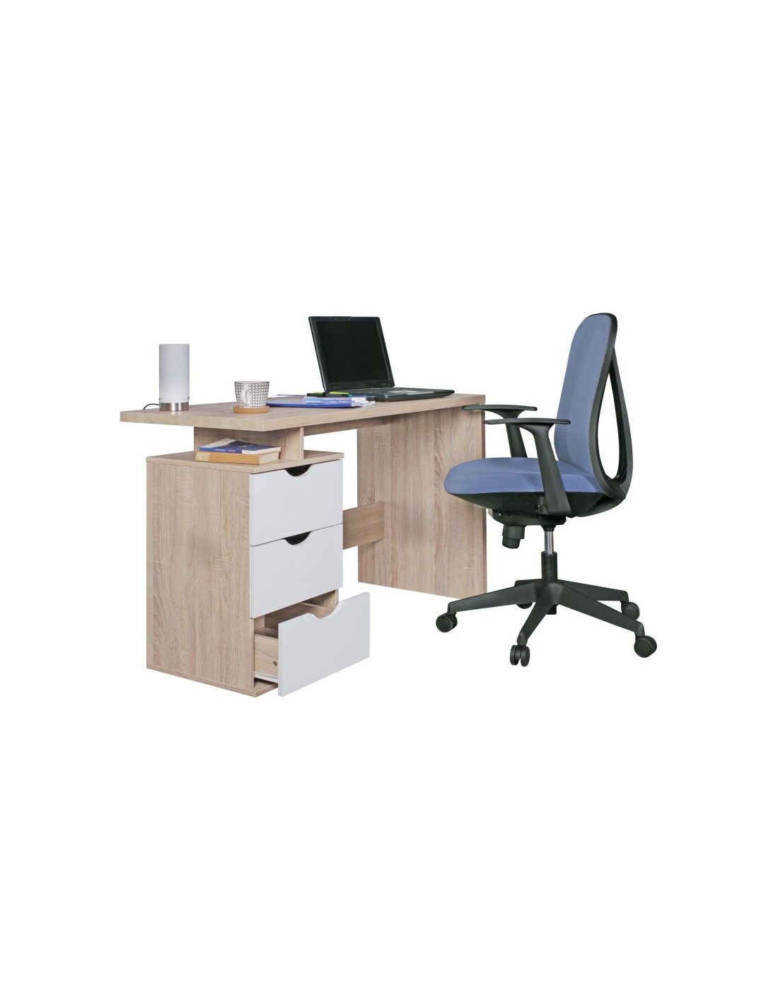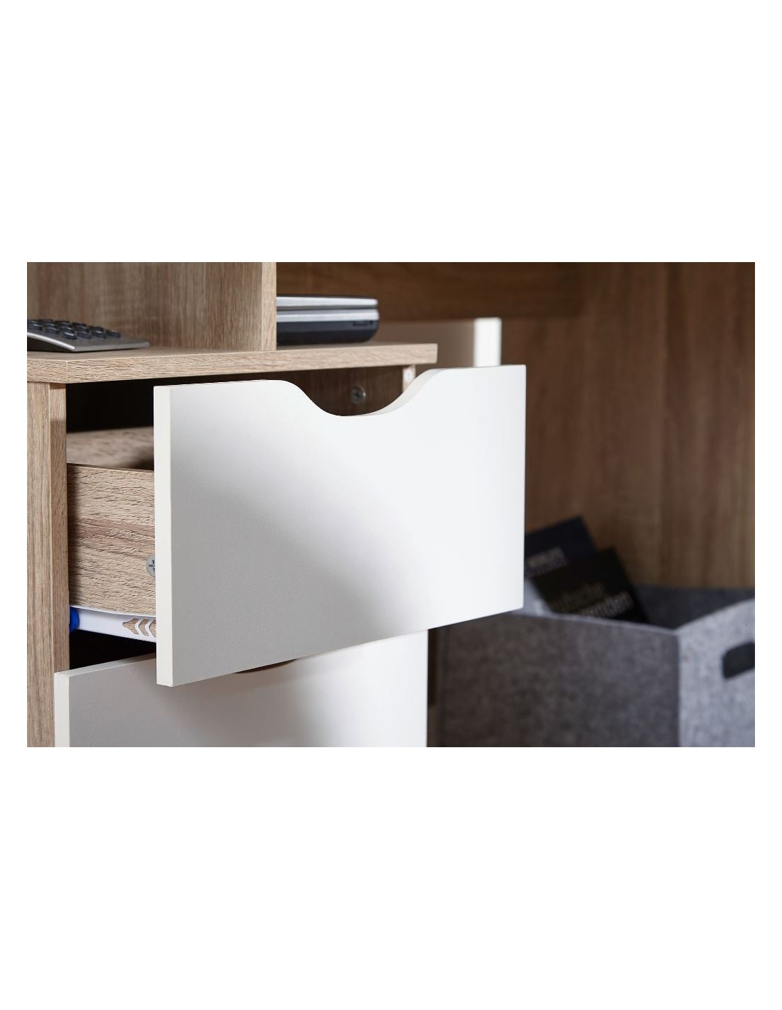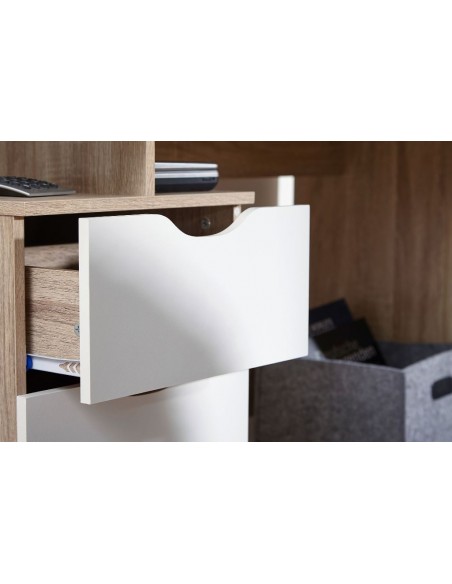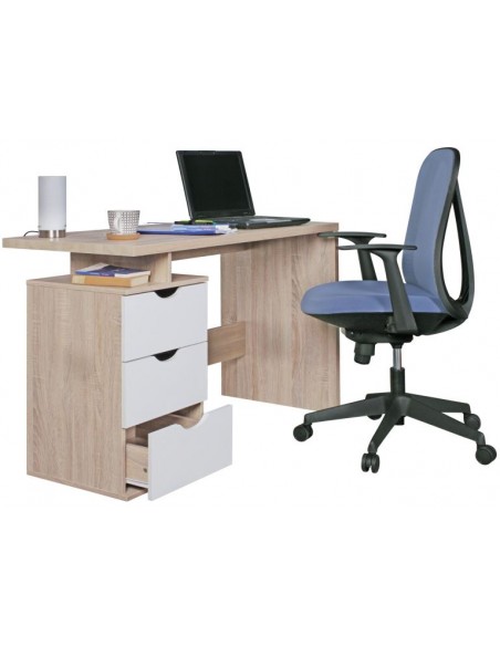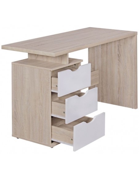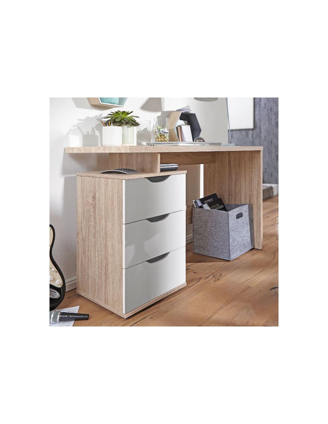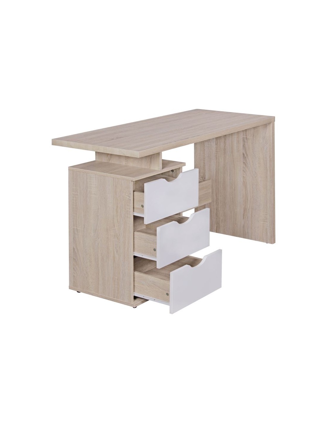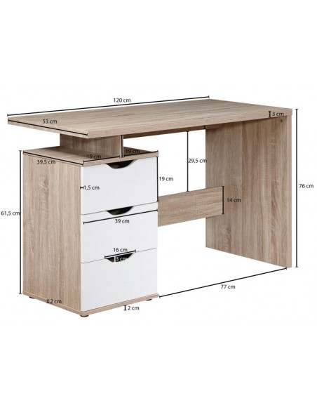 Skrivebord fremstillet i et design af hvid og sonoma egetræsfarvet møbelplade. Bordet måler 76 cm i højden og 120 x 53 cm i bredde og dybde.