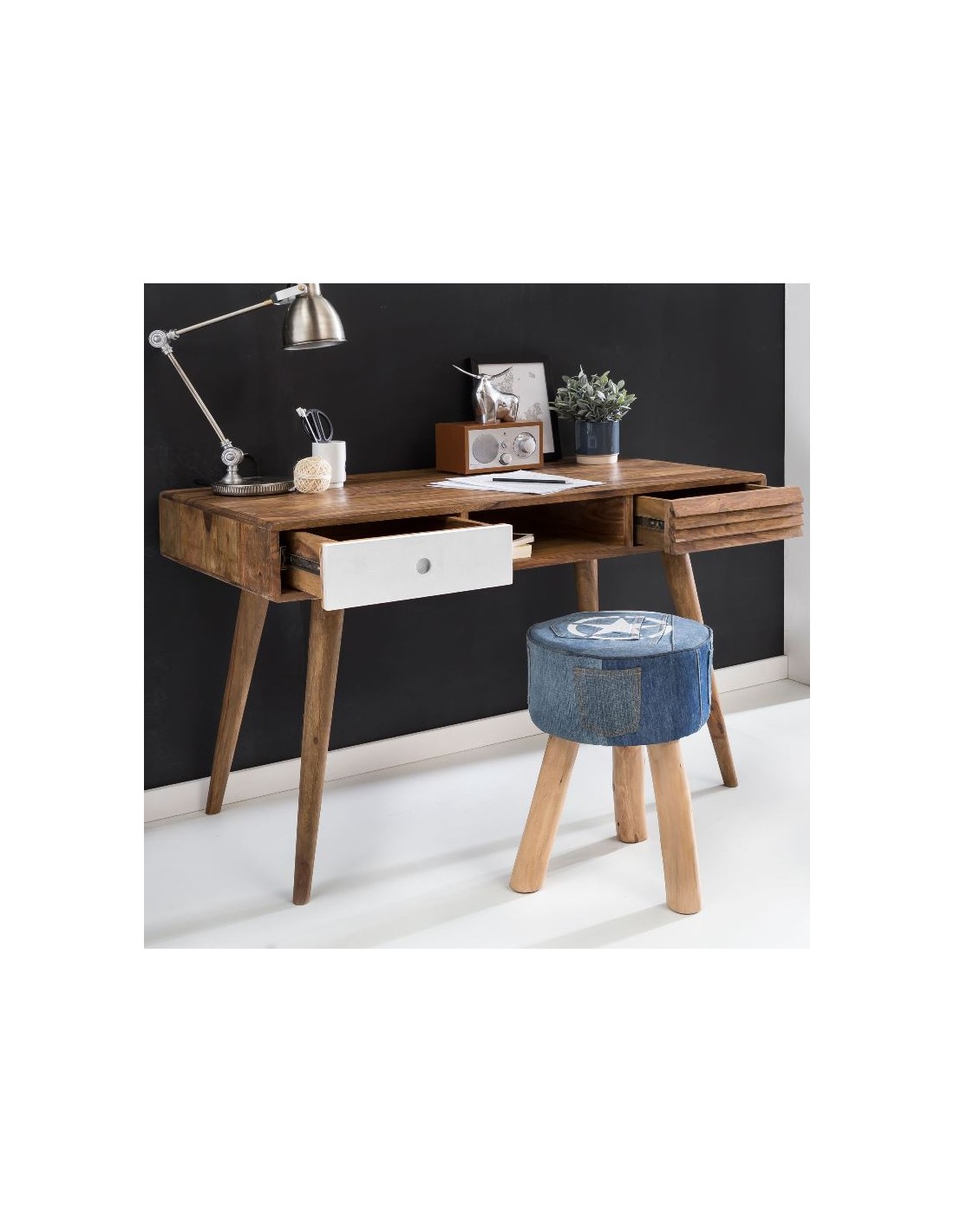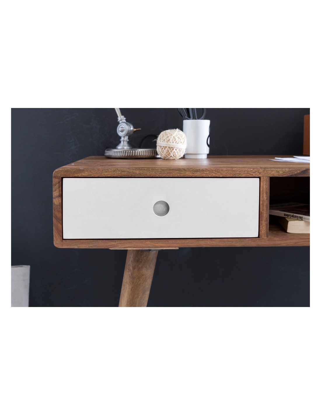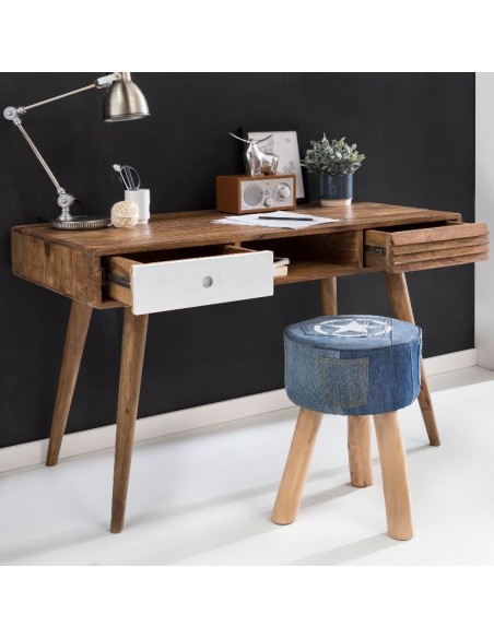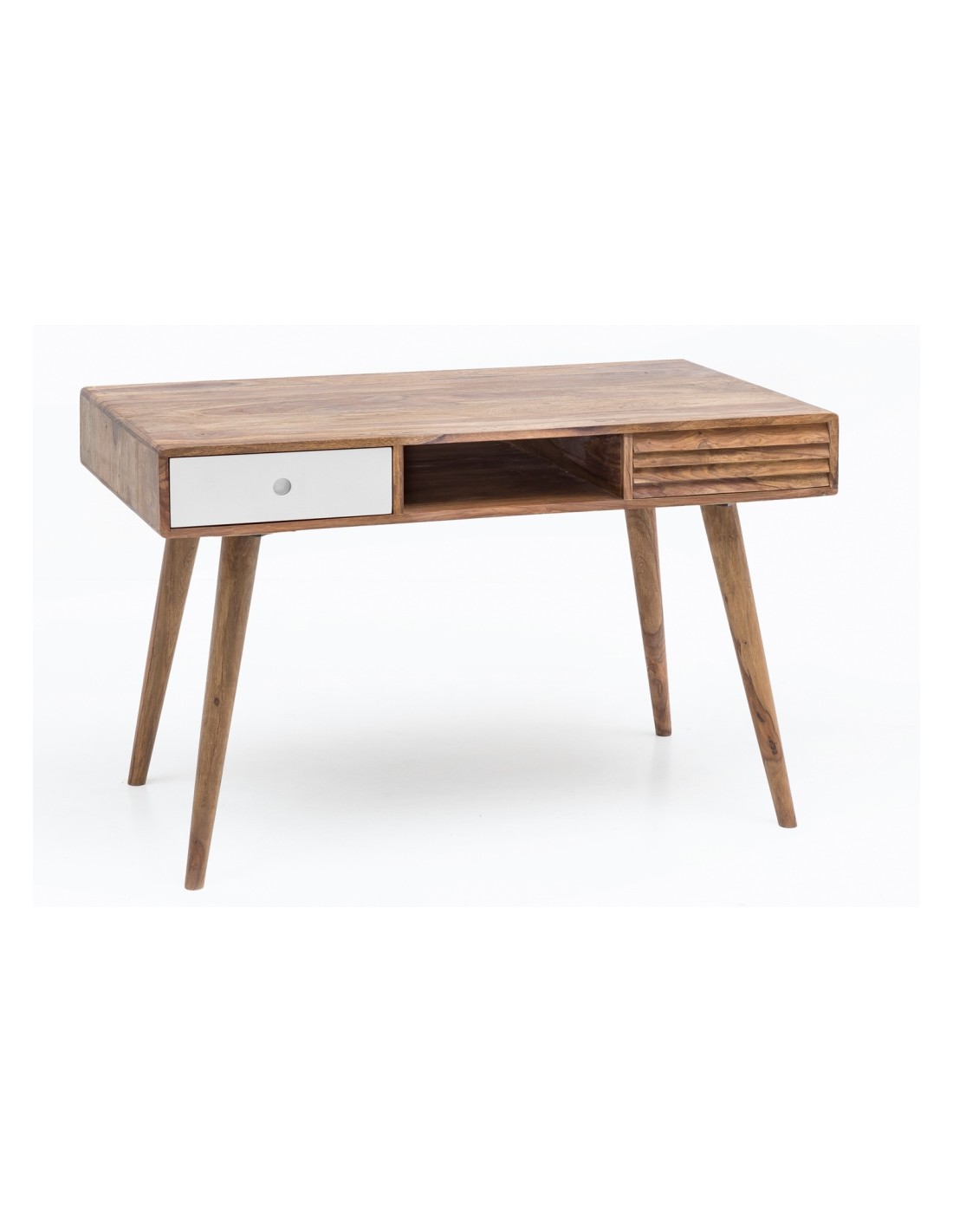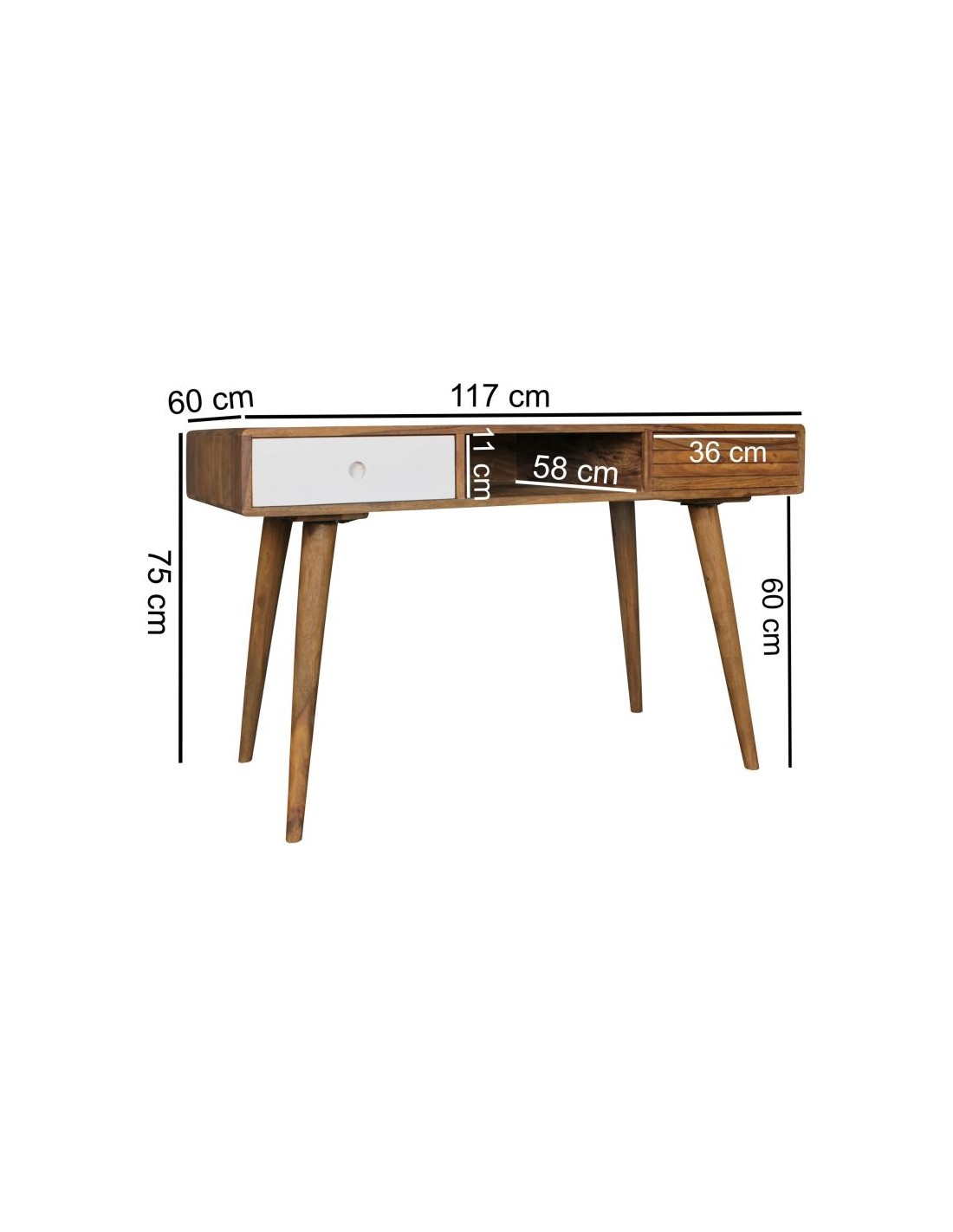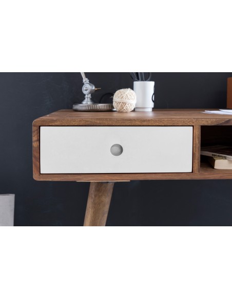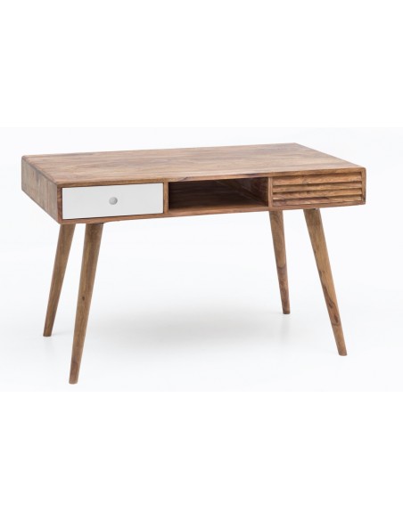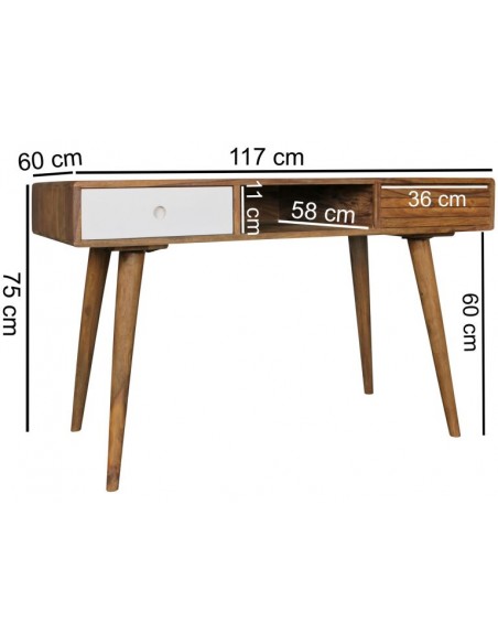 Skrivebord fremstillet i et design af hvid og brun sheeshamtræ. Bordet måler 75 cm i højden og 117 x 60 cm i bredde og dybde.