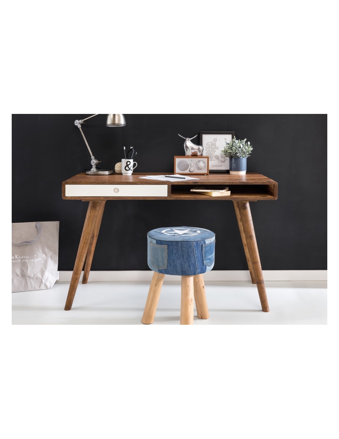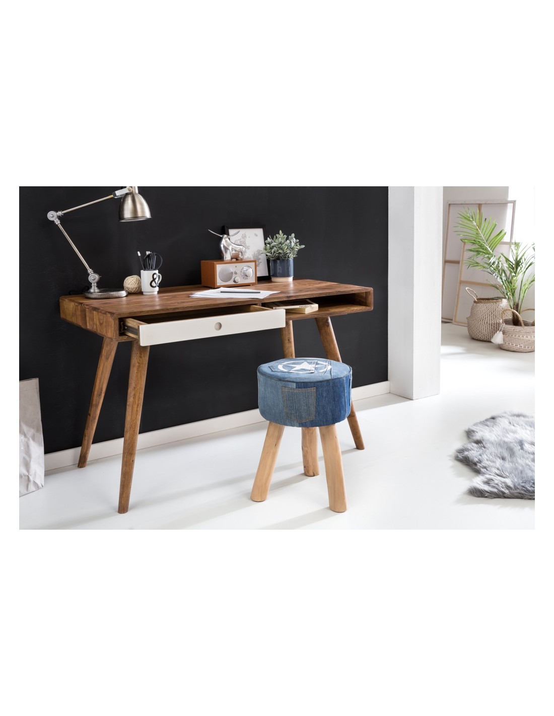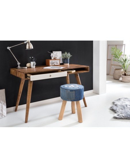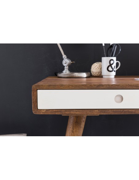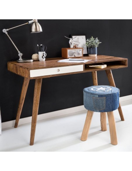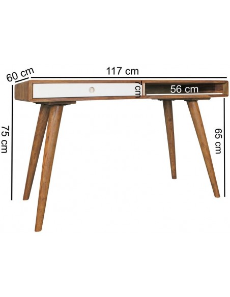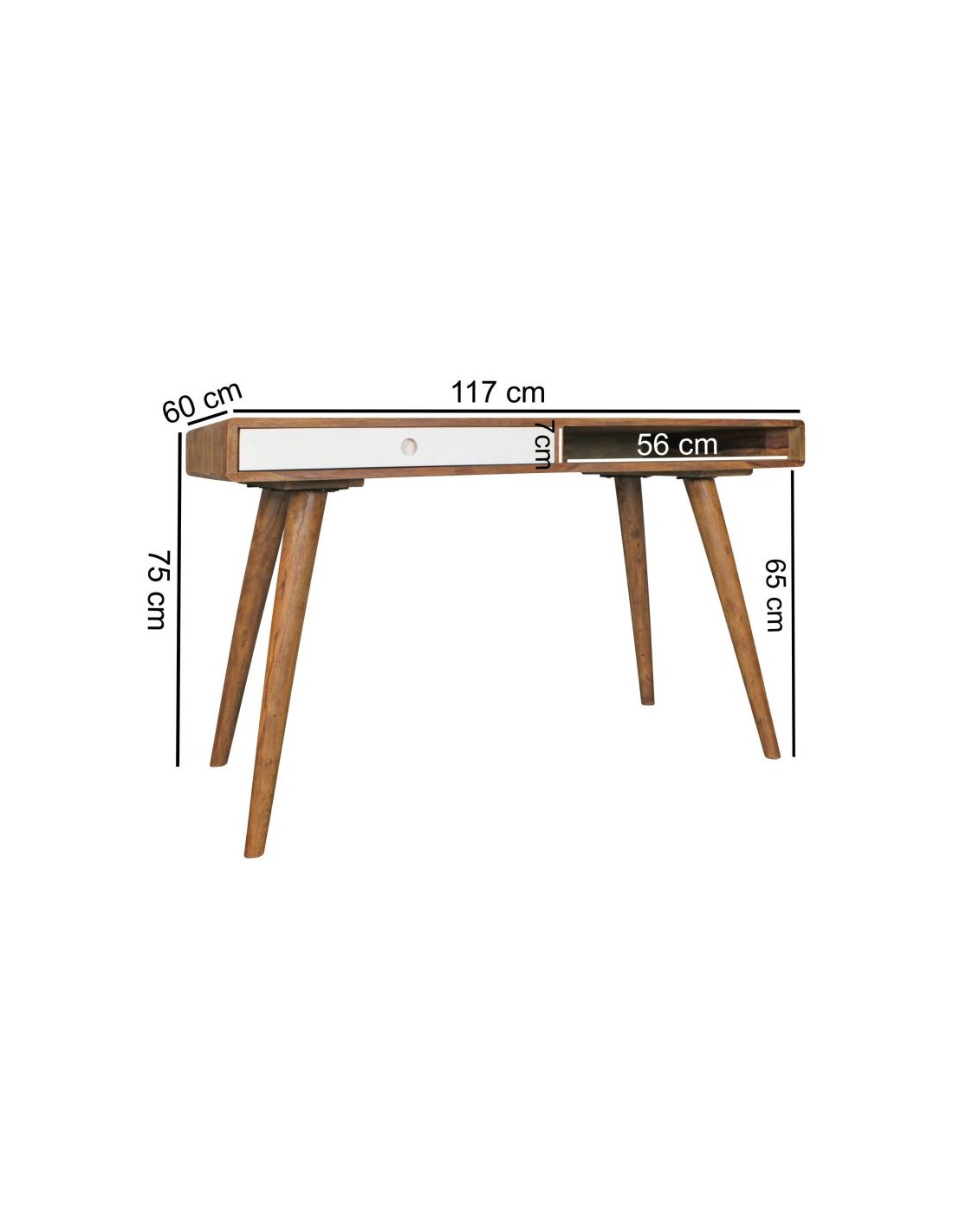 Skrivebord fremstillet i et design af hvid og brun sheeshamtræ. Bordet måler 75 cm i højden og 117 x 60 cm i bredde og dybde.